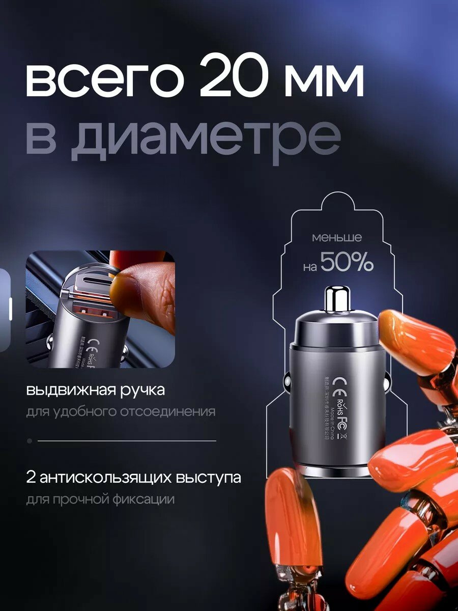 Зарядка в прикуриватель черный USB, Type-C для автомобиля, мини быстрая зарядка для телефона, модель невидимка 4 см информация: