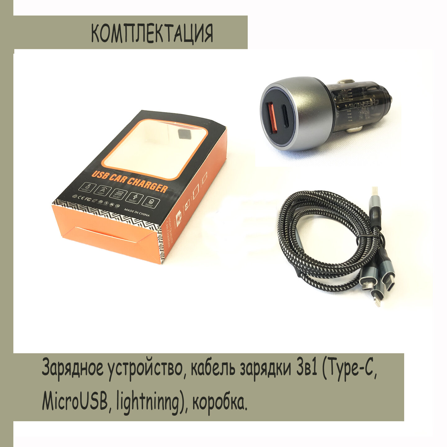 Разветвитель прикуривателя 12-24вольт PD77745 USB+Type-C автомобильная зарядка, шнур 3в1 в комплекте, серебристый информация: