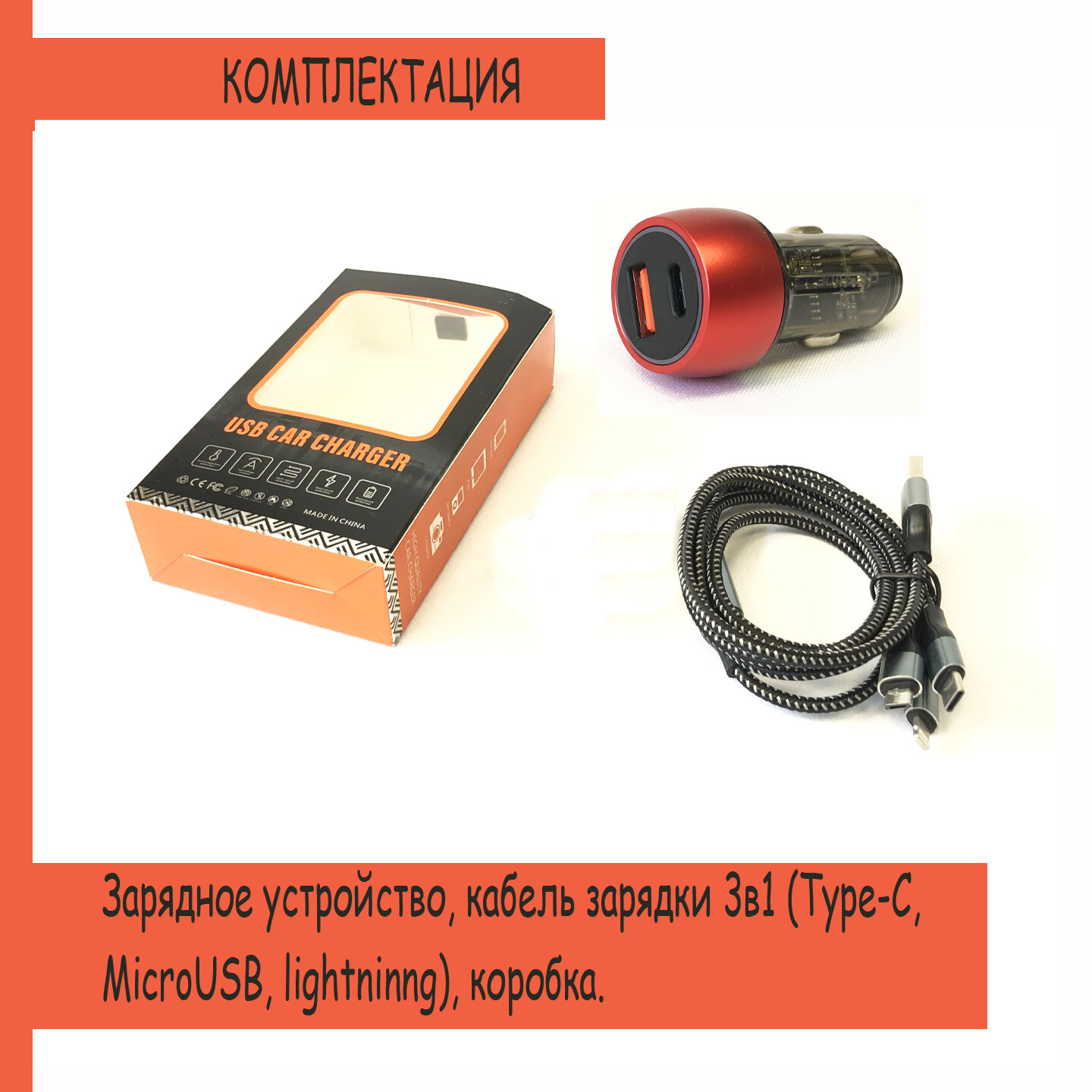 Разветвитель прикуривателя 12-24вольт PD7773 USB+Type-C автомобильная зарядка, шнур 3в1 в комплекте, красный информация: