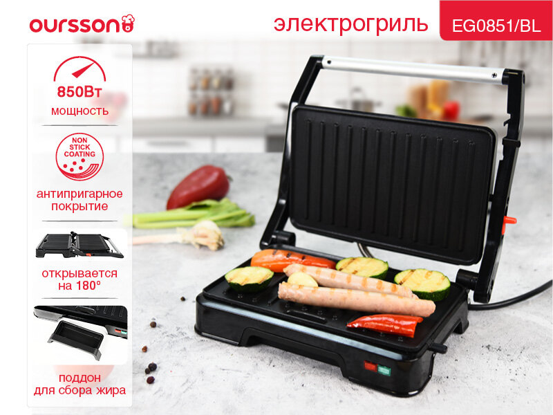 10 цен на Электрогриль Oursson EG0851/BL, мощность 850Вт, антипригарное покрытие, чёрный