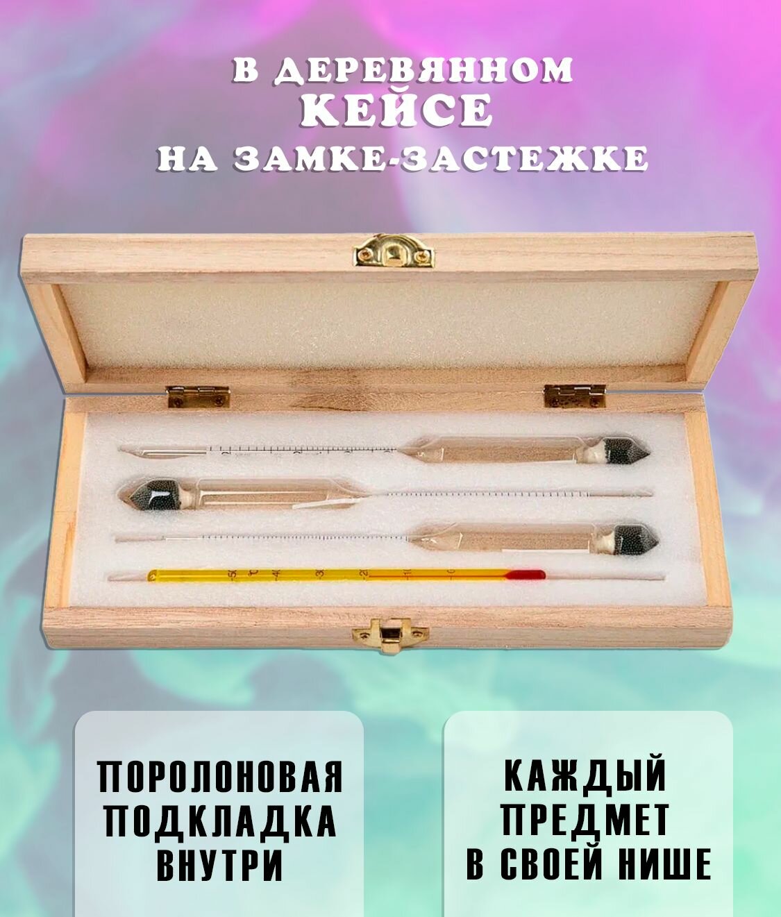 Набор спиртометров АСП-3 с термометром (ареометры 0-40, 40-70, 70-100) в деревянном кейсе АМ-193 информация:
