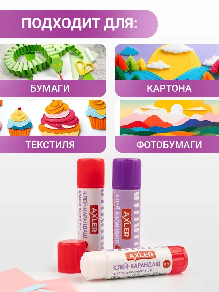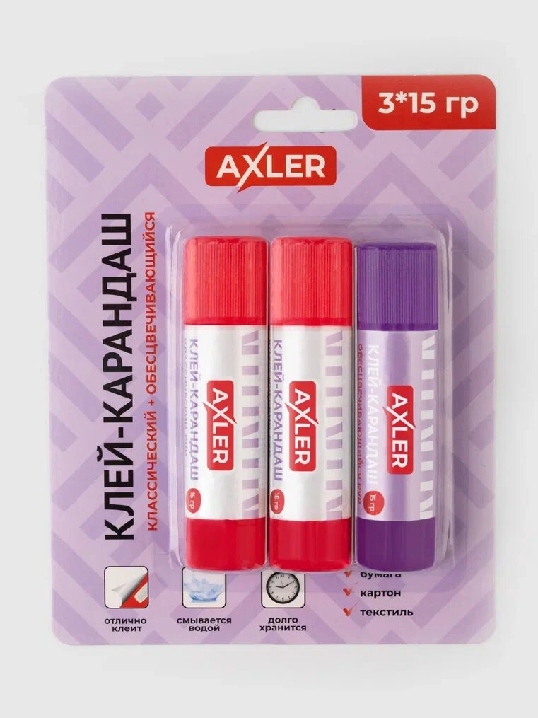 Клей карандаш канцелярский набор AXLER для бумаги и картона, PVP прозрачный и цветной обесцвечивающийся, 3 шт по 15г информация: