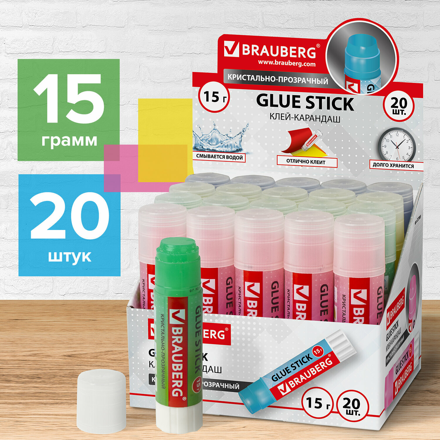 Клей-карандаш BRAUBERG "COLOR Crystal", 15 г, комплект 20 штук, прозрачный, 880112 информация: