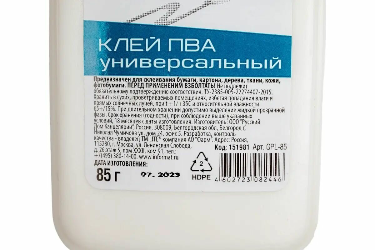 Клей ПВА Lite 85 гр, офис, универсальный, жидкий, с дозатором информация: