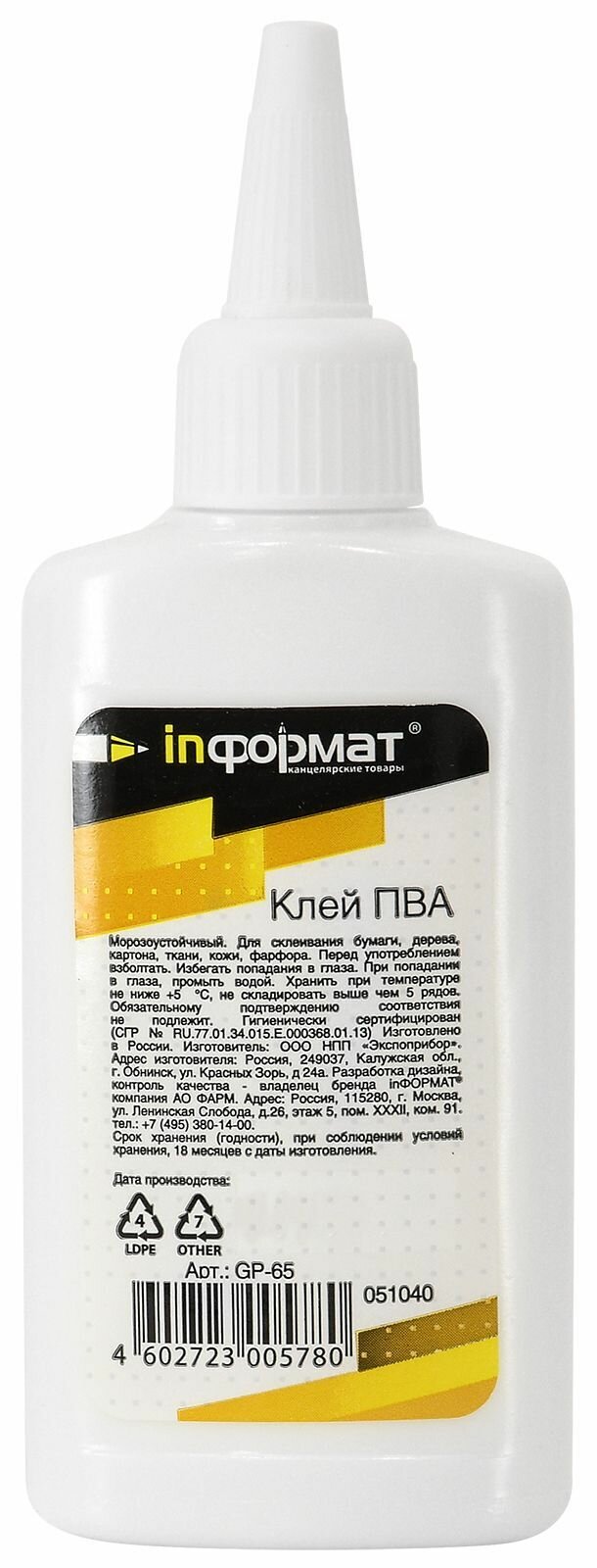 Клей ПВА INFORMAT с дозатором, 65г, универсальный, в заводской упаковке информация: