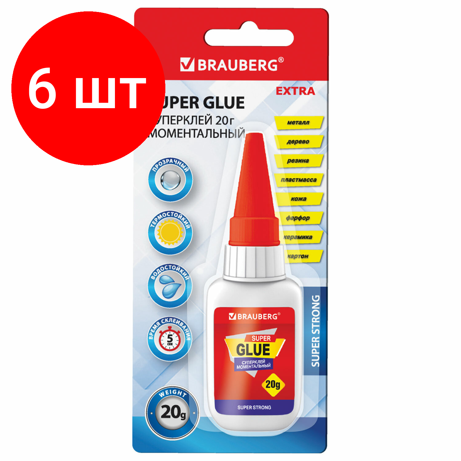 Комплект 6 шт, Клей моментальный ультрапрочный суперклей BRAUBERG EXTRA 20 грамм максимальный объем, 608101, (HC-20) информация: