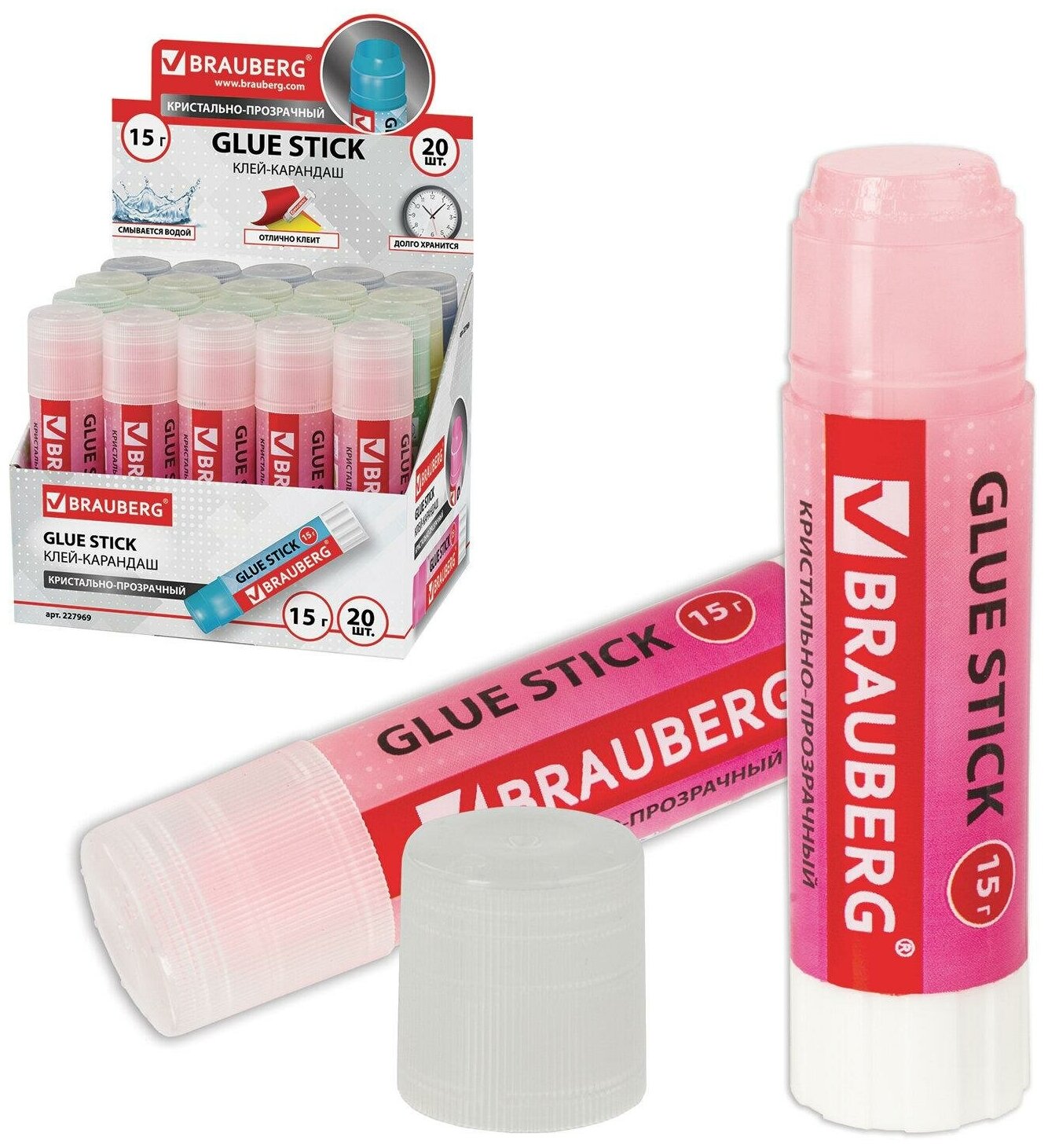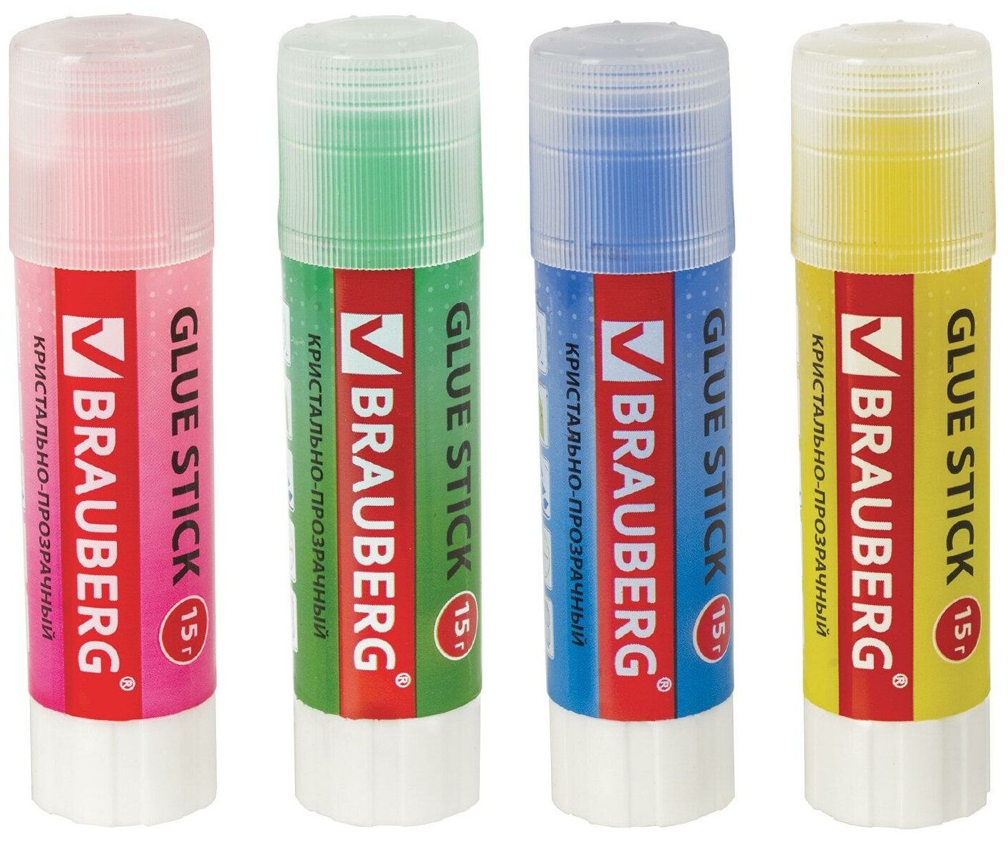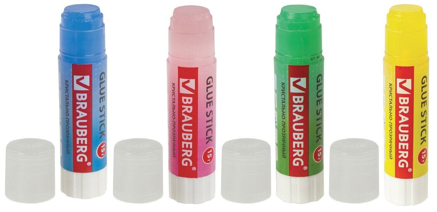 Клей-карандаш BRAUBERG "COLOR Crystal", 15 г, прозрачный, ассорти, 227969, PVP информация: