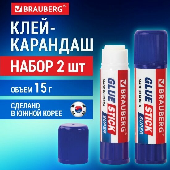 Клей-карандаш Brauberg 15 г, SUPER, выгодная упаковка, комплект 2 штуки в пакете, южная корея, 881033 информация: