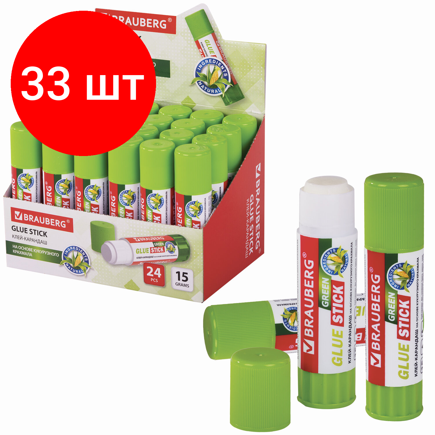 Комплект 33 шт, Клей-карандаш на натуральной основе BRAUBERG GREEN, 15 г, 270437 информация: