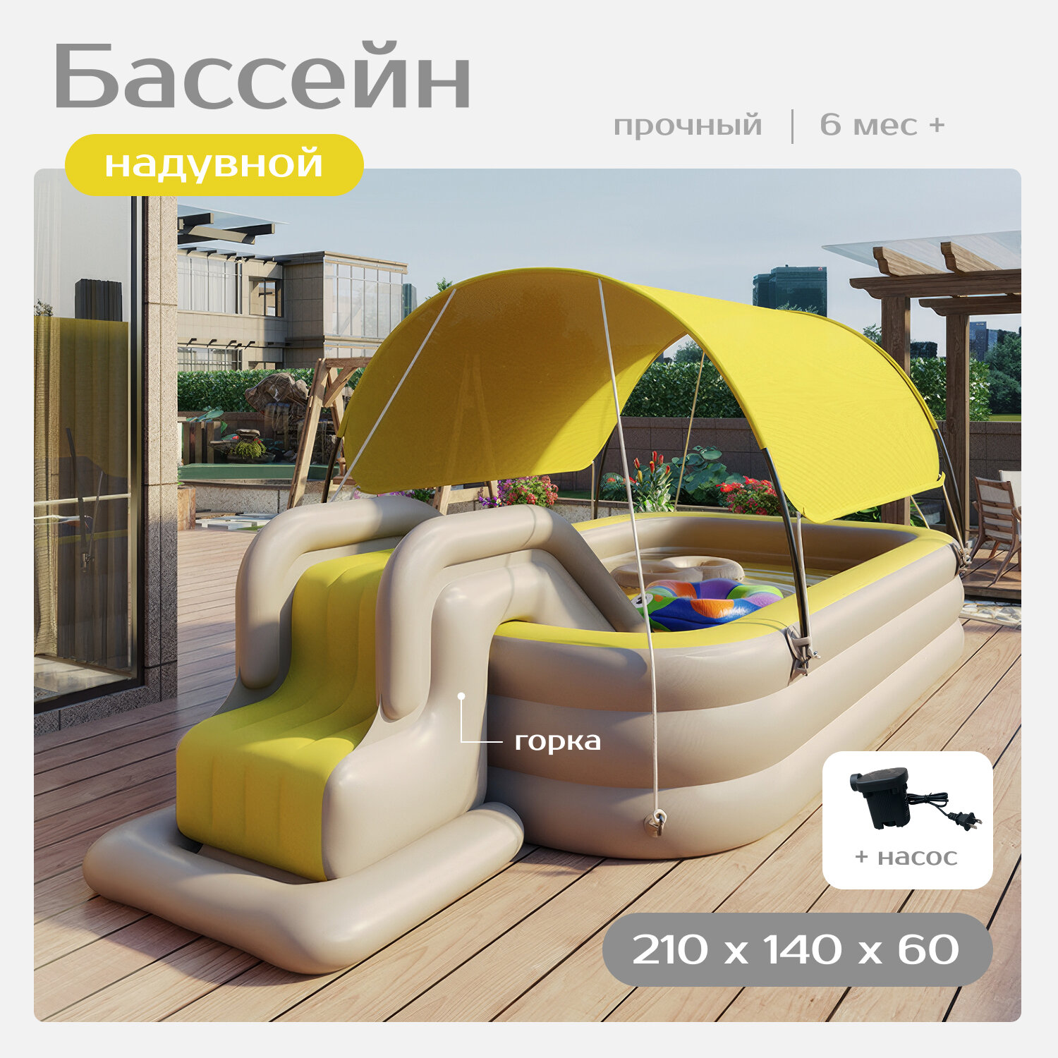 Детский надувной бассейн, складной 2.1 метра желтого цвета + тент + горка + проводной насос информация: