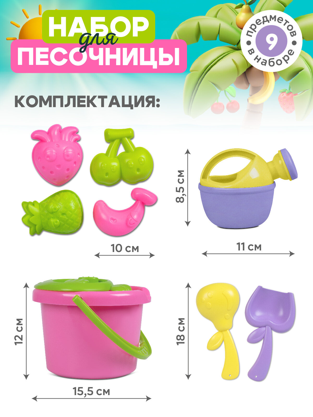 10 цен на Песочный набор "Фрукты", ведёрко, сито, леечка, лопатка, грабли и 4 формочки, JB5300921