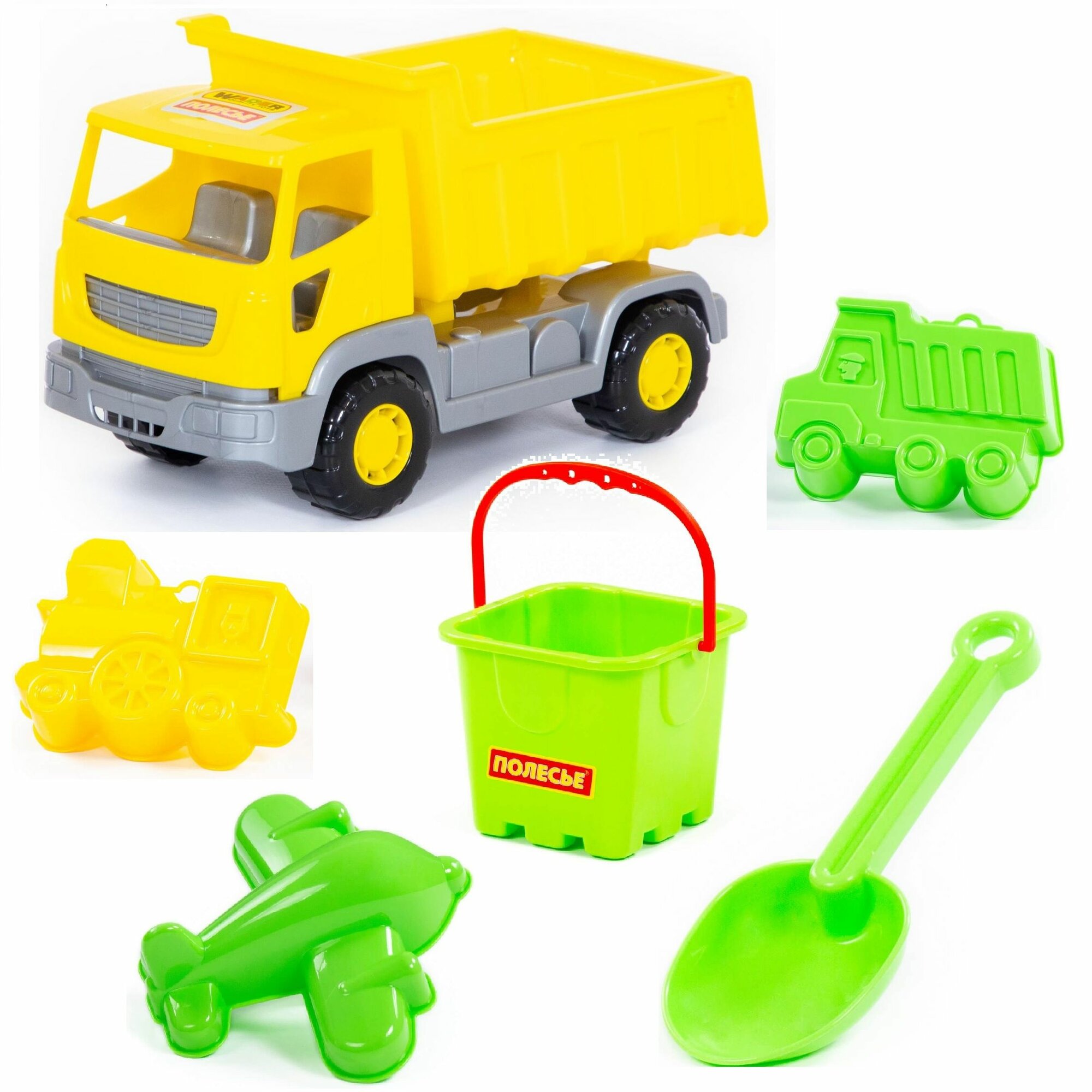 Набор для песочницы с самосвалом 26 см с закрытым бортом, 3-мя формочками, ведерком и совком / Полесье информация: