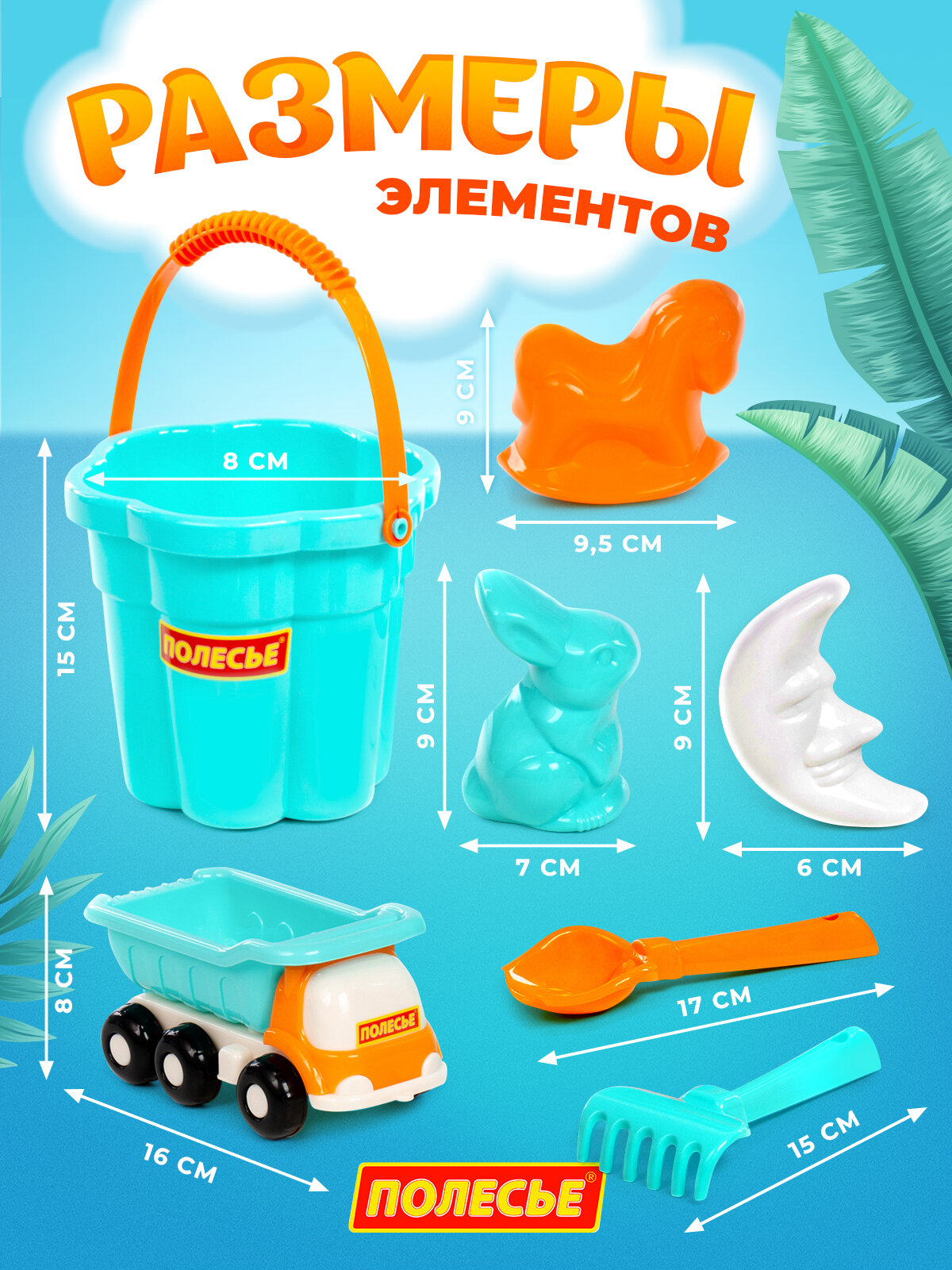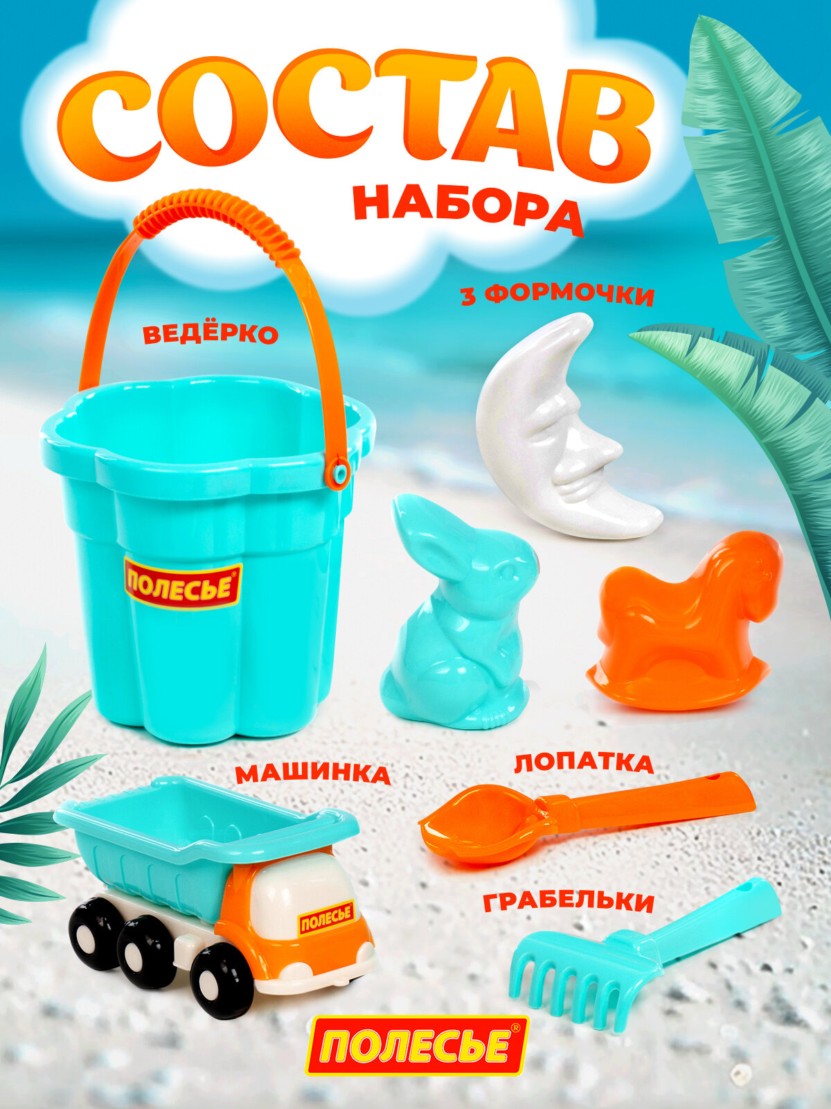 Набор для песочницы с бирюзовым ведром-цветком и машинкой, 7 предметов, пластик, от 1 года Полесье информация: