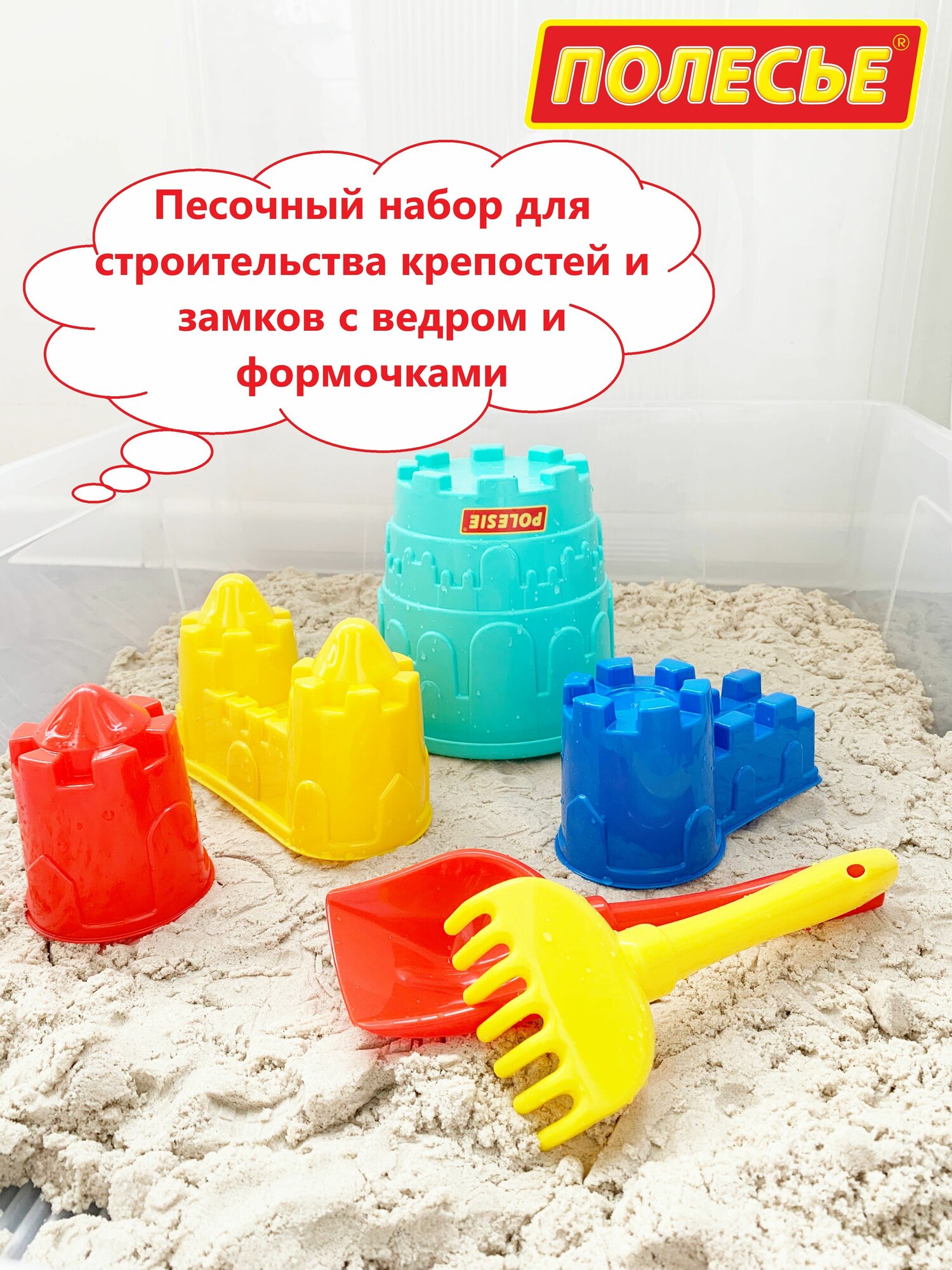 Песочный набор: Ведро-Замок, 3 формочки крепость, лопатка и грабельки №5 / Полесье информация: