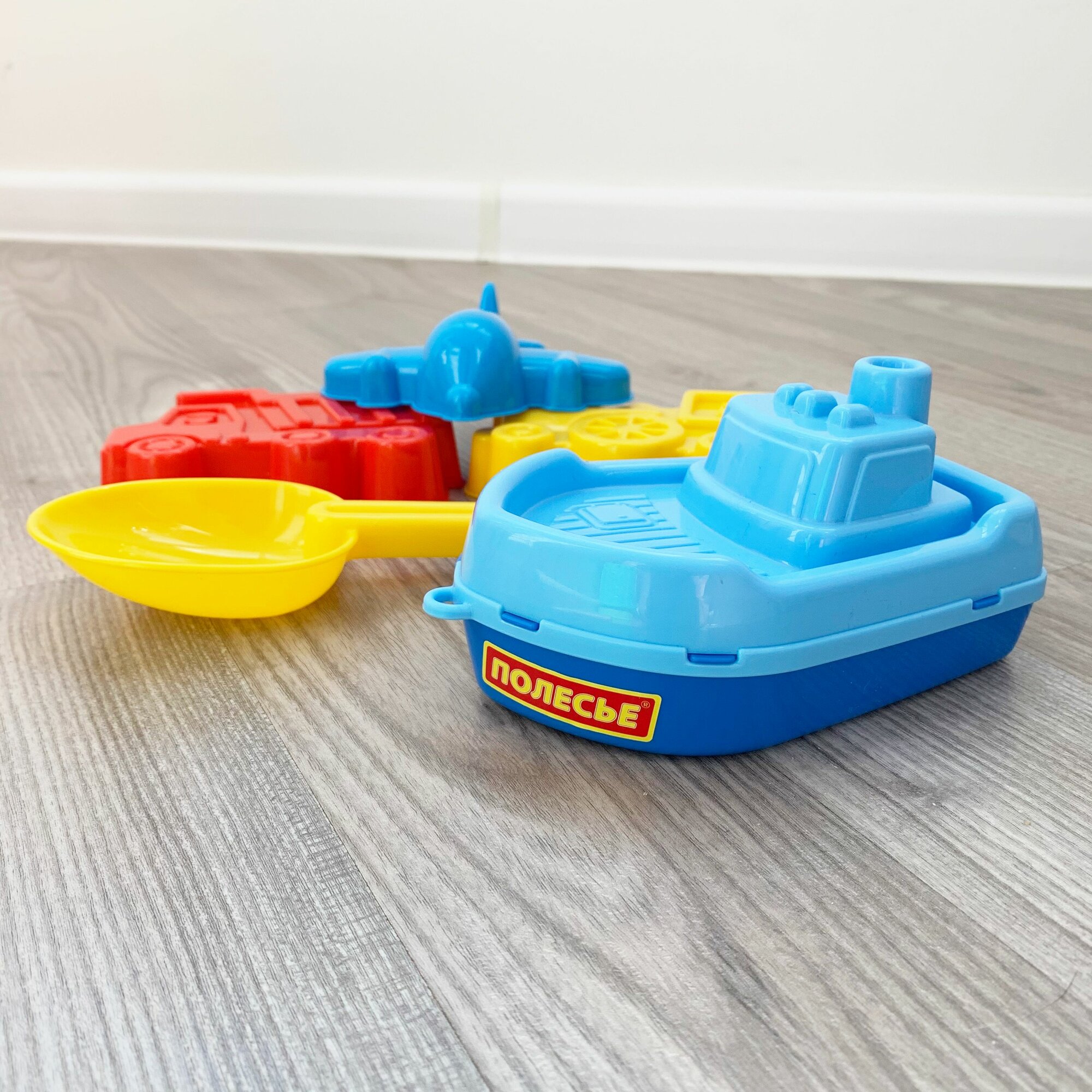 Игрушки для песочницы: Формочки для песка для мальчика самосвал, паровоз, самолет, кораблик, совок / Полесье желто-голубой информация: