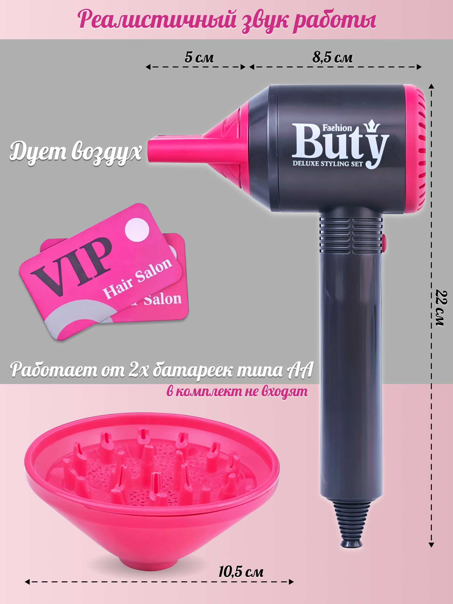 Набор парикмахера детский фен с 2 насадками для девочек на батарейках, 2 карточки VIP информация: