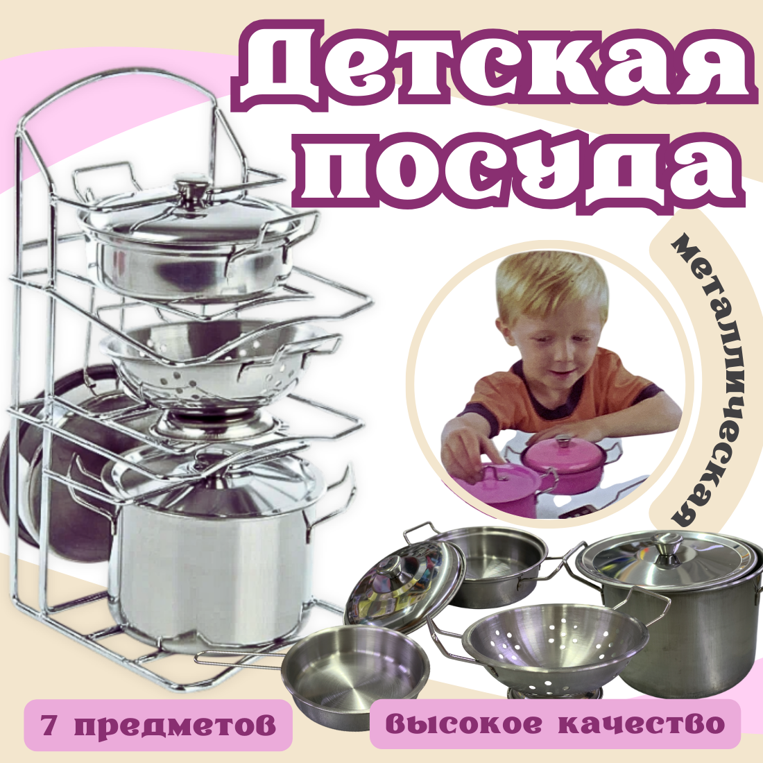Отзывы на Игровой набор металлической посуды, для детей, на подставке, 7 элементов