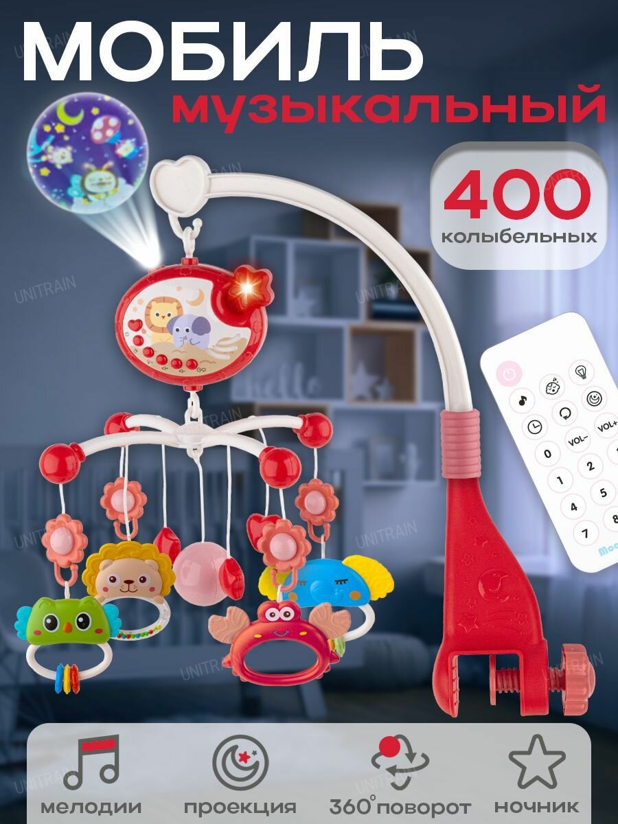 Мобиль на кроватку для новорожденных, музыкальный, с проектором и ночником, красный информация: