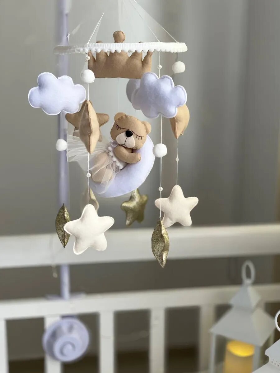 Мобиль на кроватку музыкальный для новорожденных и кронштейн из дерева-3