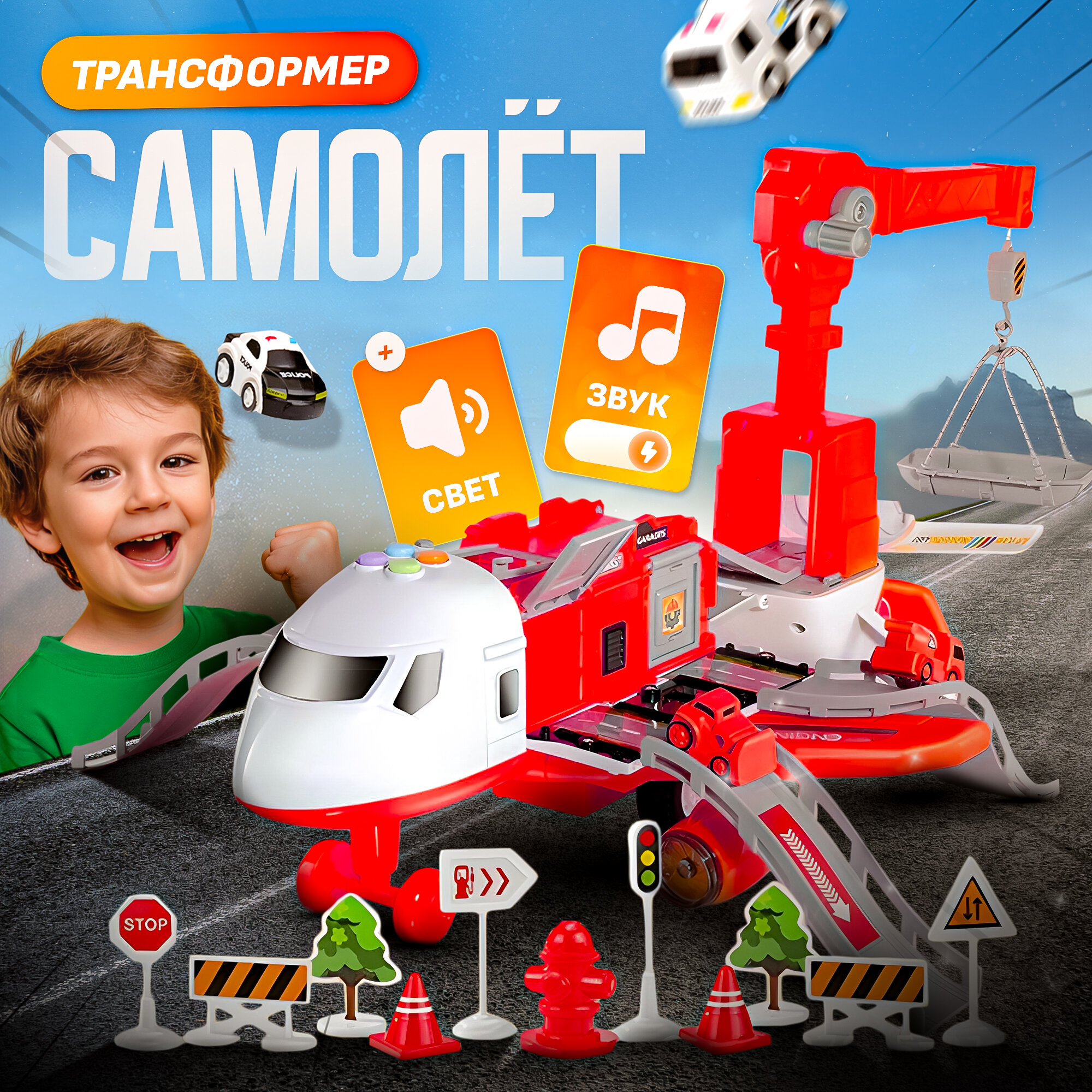 Отзывы на Пожарный самолет SHARKTOYS, со светом и звуком, инерционный, с краном, с 3 машинками и дорожными знаками, красный