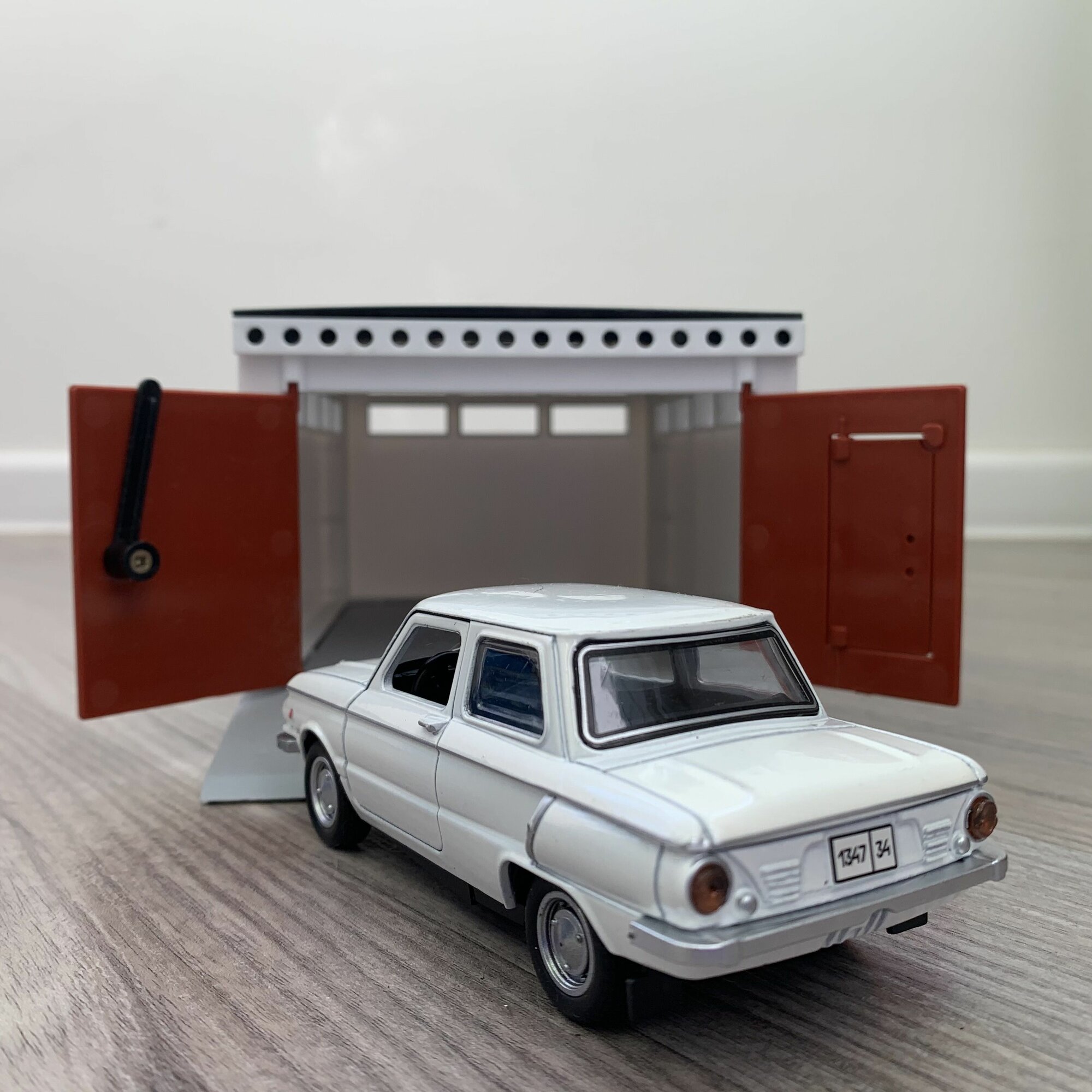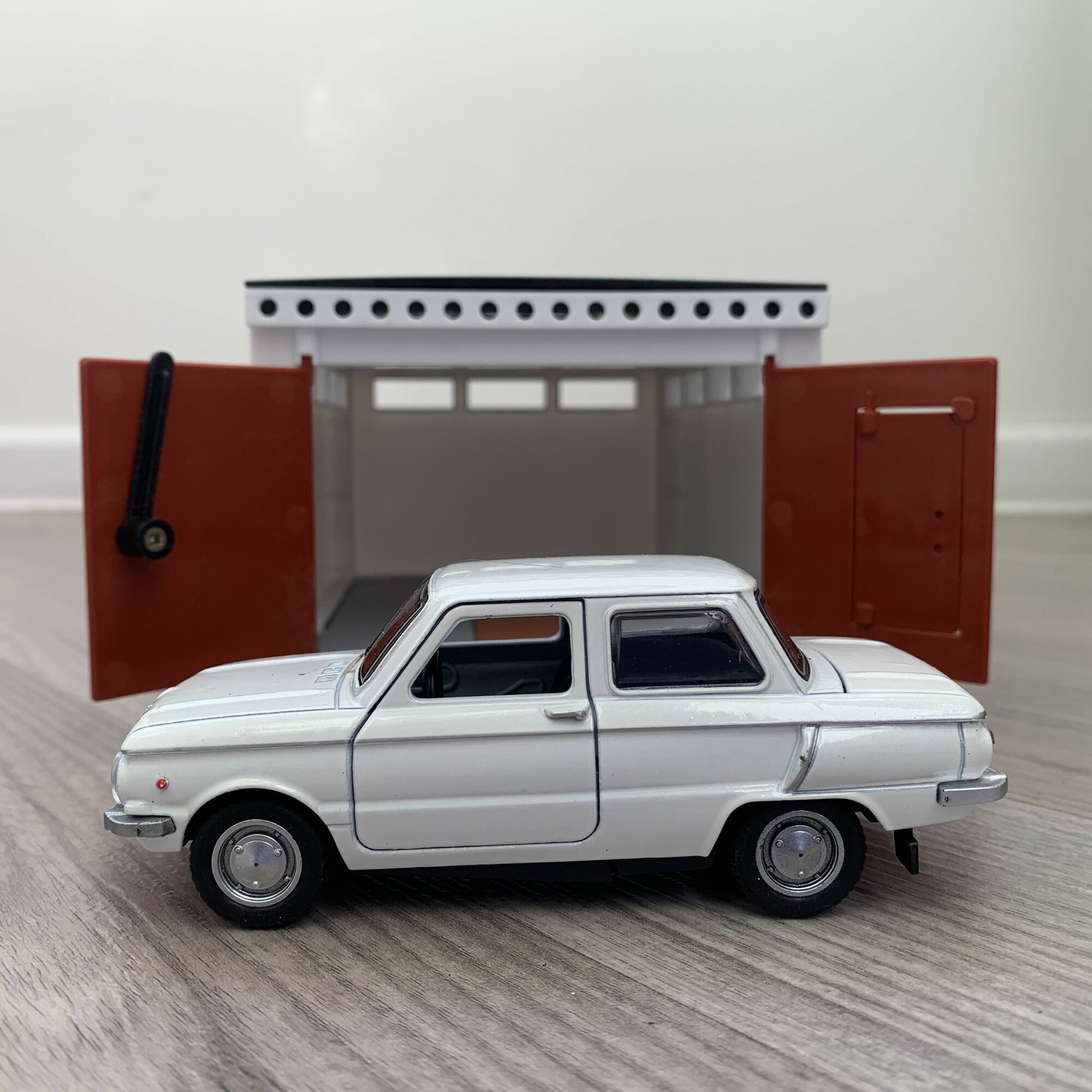 Гараж + машинка модель Запорожец ЗАЗ-968А (12 см, метал, инерция, открытие 2-х дверей, багажника) - белый информация: