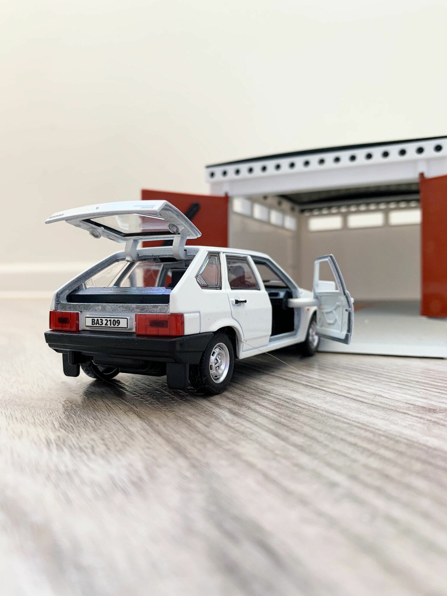 10 цен на Гараж + машинка модель ВАЗ 2109 (12 см, метал, инерция, открытие 2-х дверей, багажника) - белый