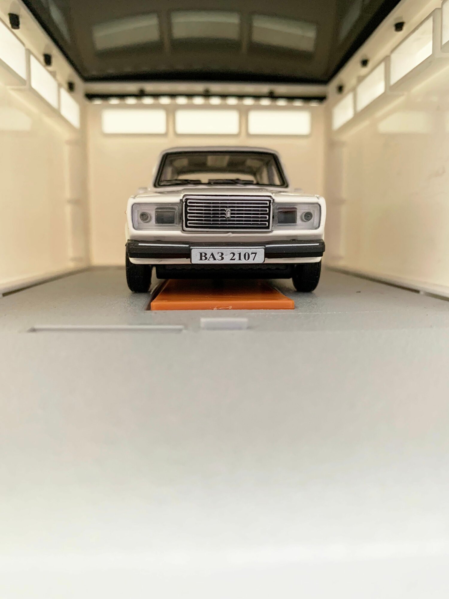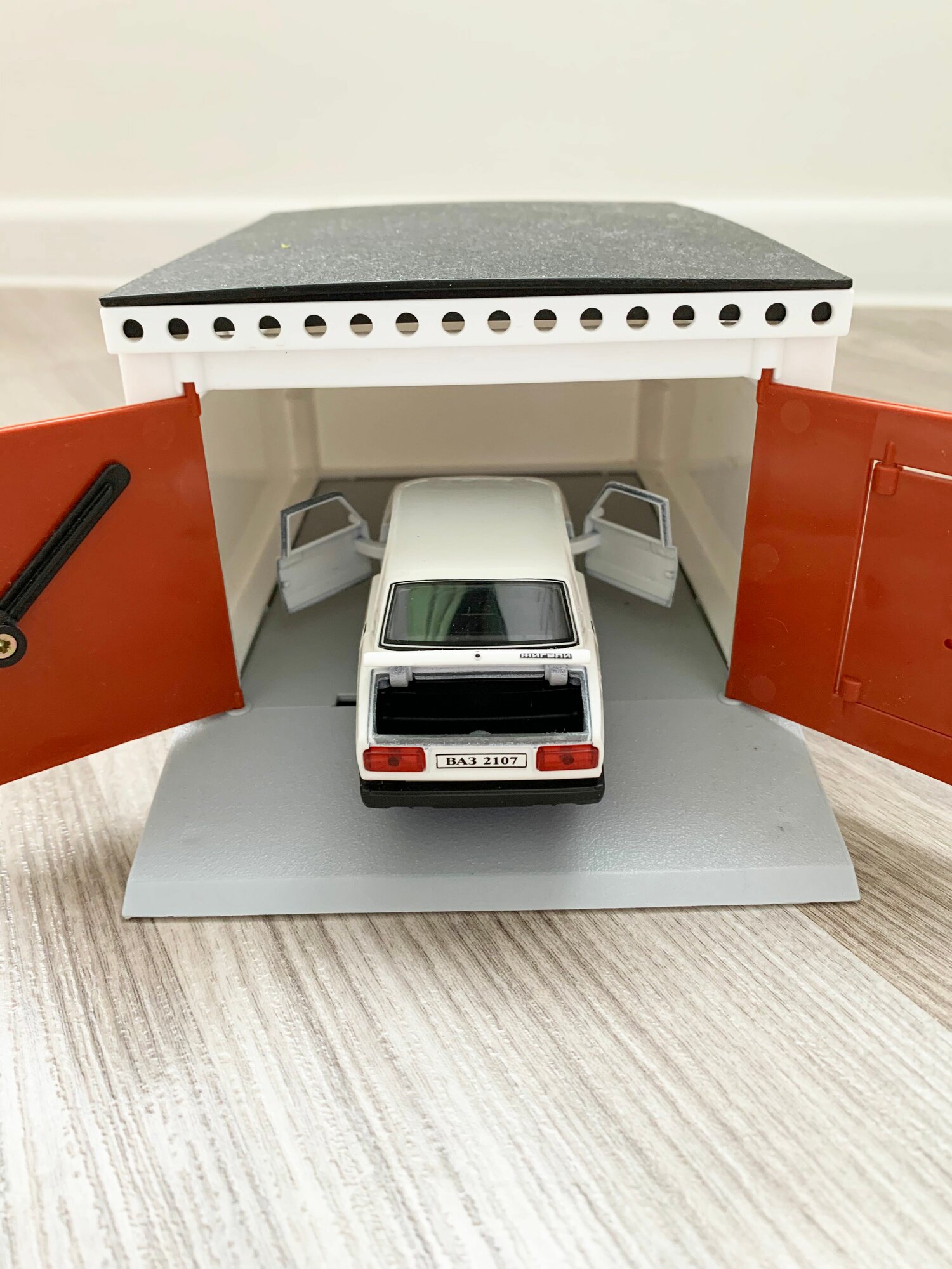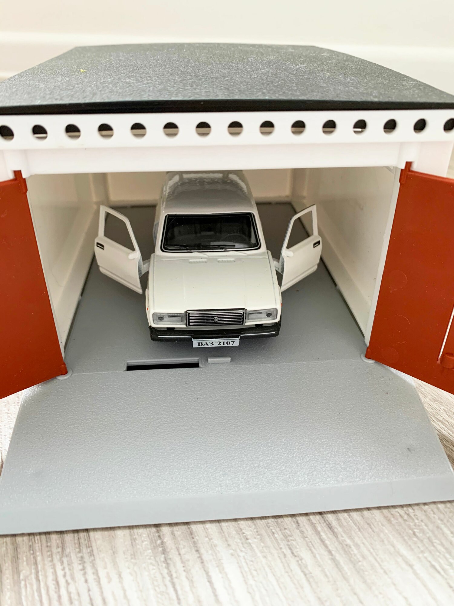 Гараж + машинка модель ВАЗ 2107 (12 см, метал, инерция, 2 откр. двери и багажник) - белая информация: