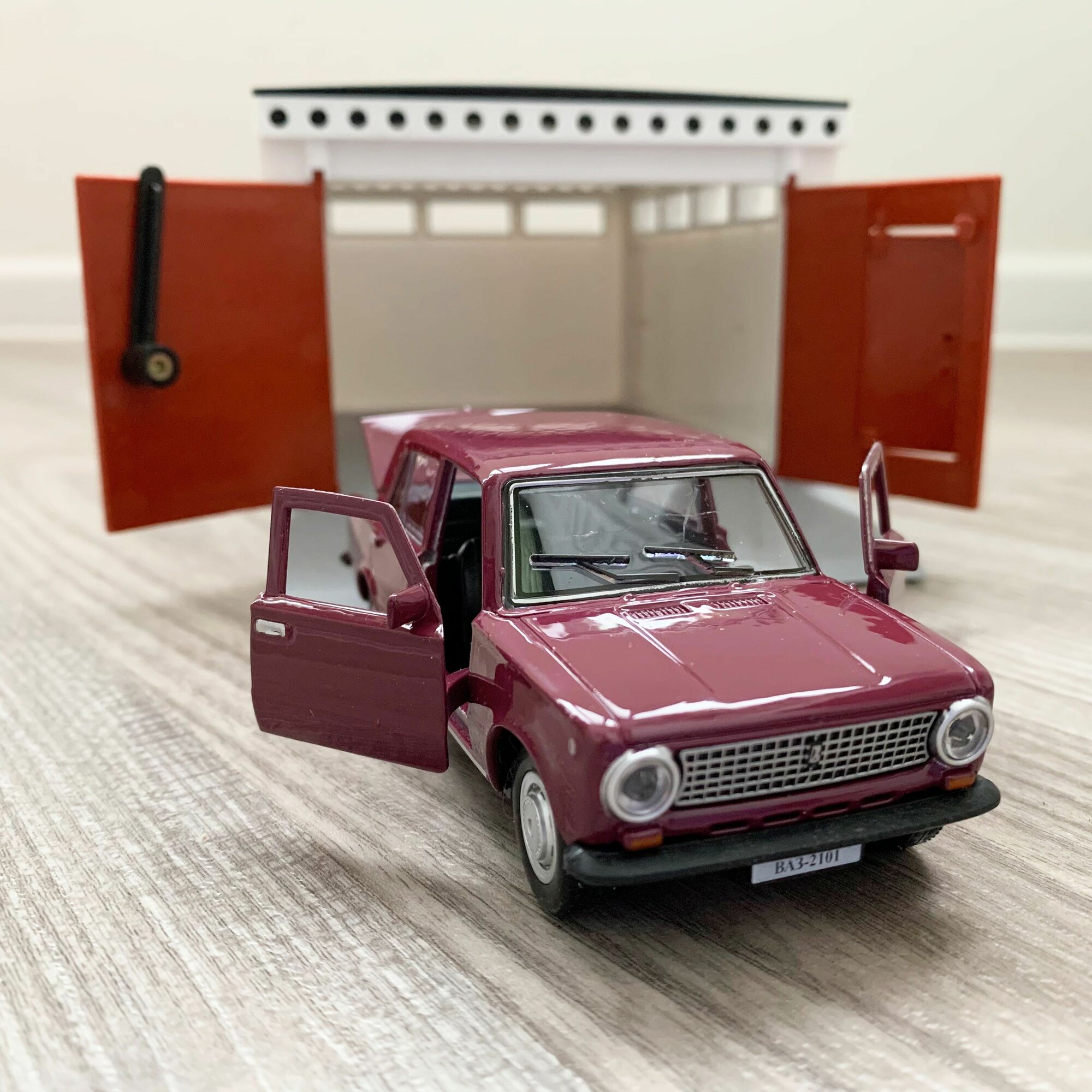 Гараж + машинка модель ВАЗ 2101 (метал, 12 см, инерция, открытие 2-х дверей и багажника) -фиолетовая информация: