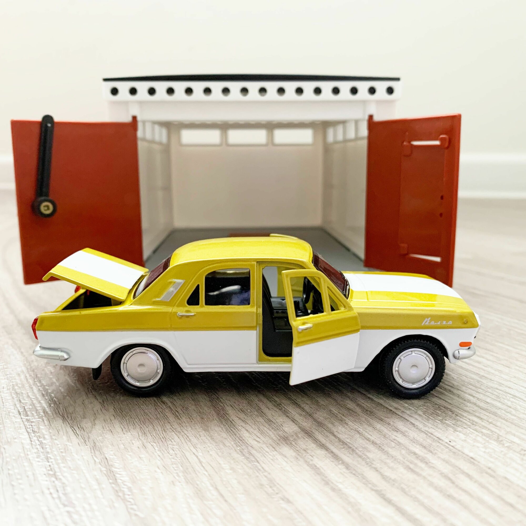 Гараж + Волга ГАЗ 2401 (седан, 12 см, метал, инерц, откр. дверей и багажника) - золотой информация: