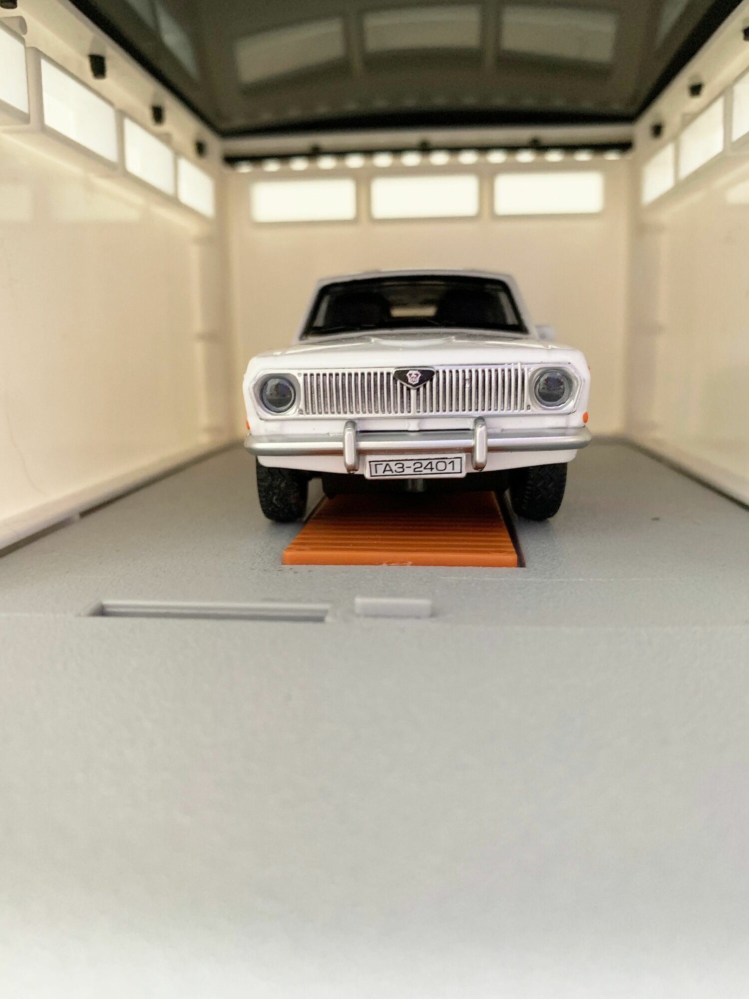 Гараж + Волга ГАЗ 2401 (седан, 12 см, метал, инерц, откр. дверей и багажника) - белая информация: