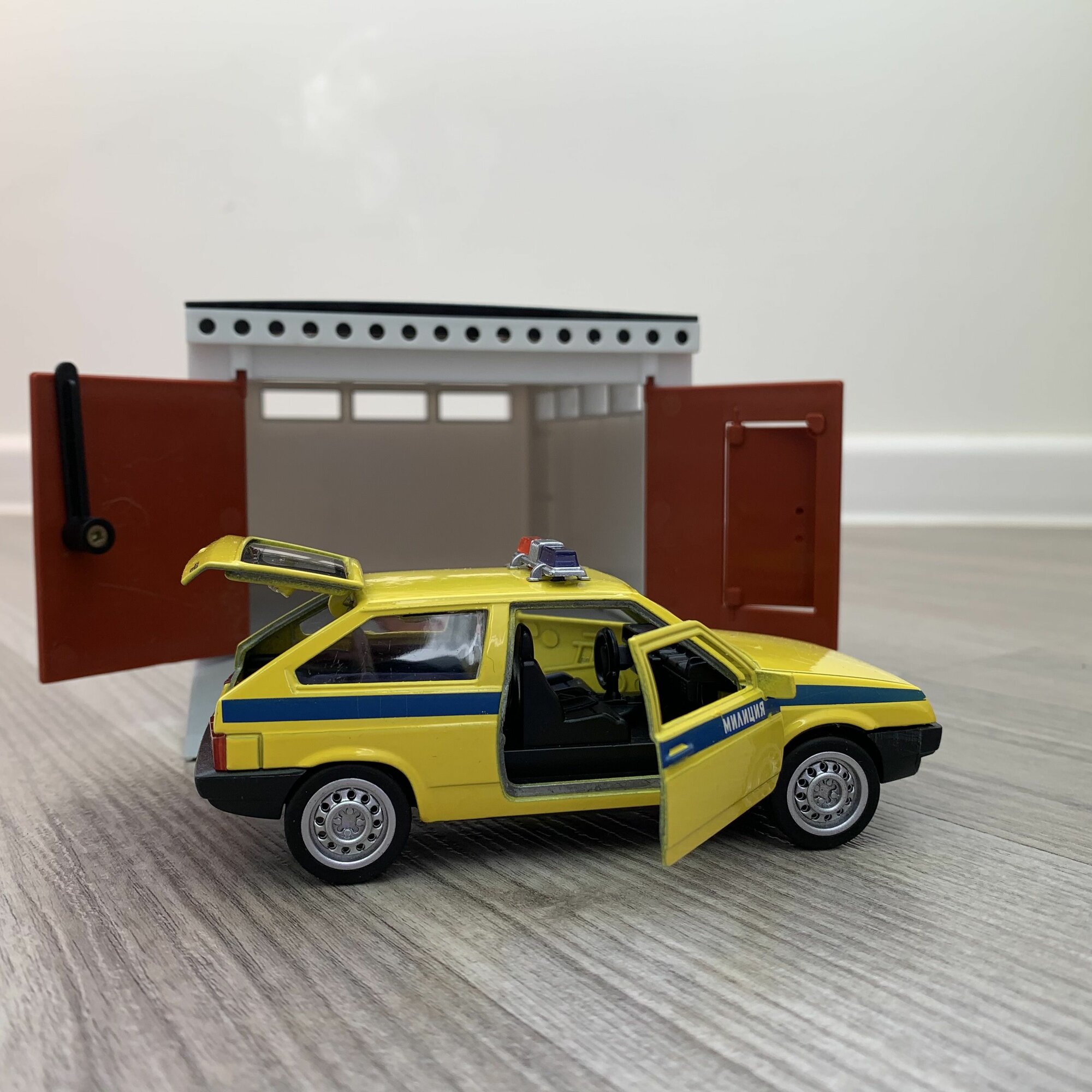 Гараж ретро и машинка 2108 милиция СССР (12 см, метал, инерция, свет, звук, открытие 2-х дверей и багажника) -желтая информация: