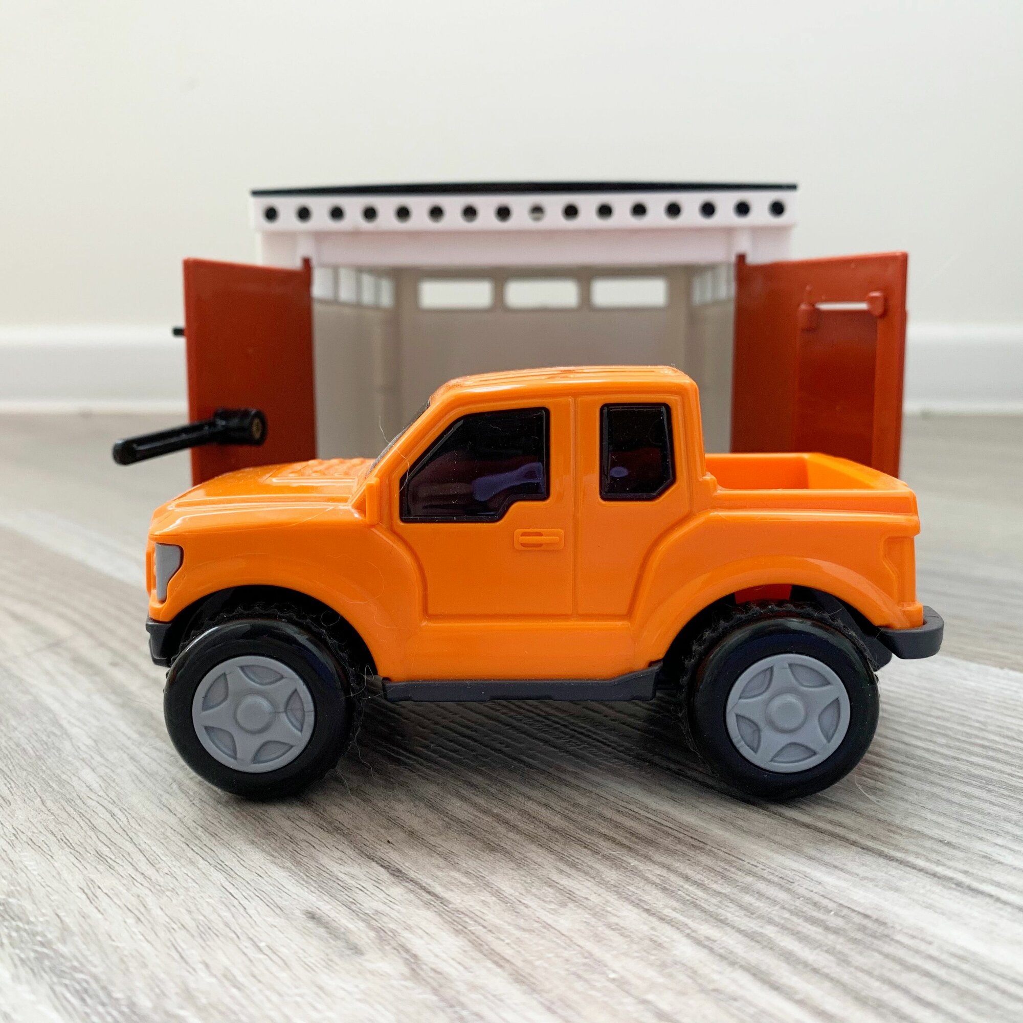 Гараж с распашными воротами + пластмассовая инерционная машинка пикап 12 см / Полесье оранжевый информация: