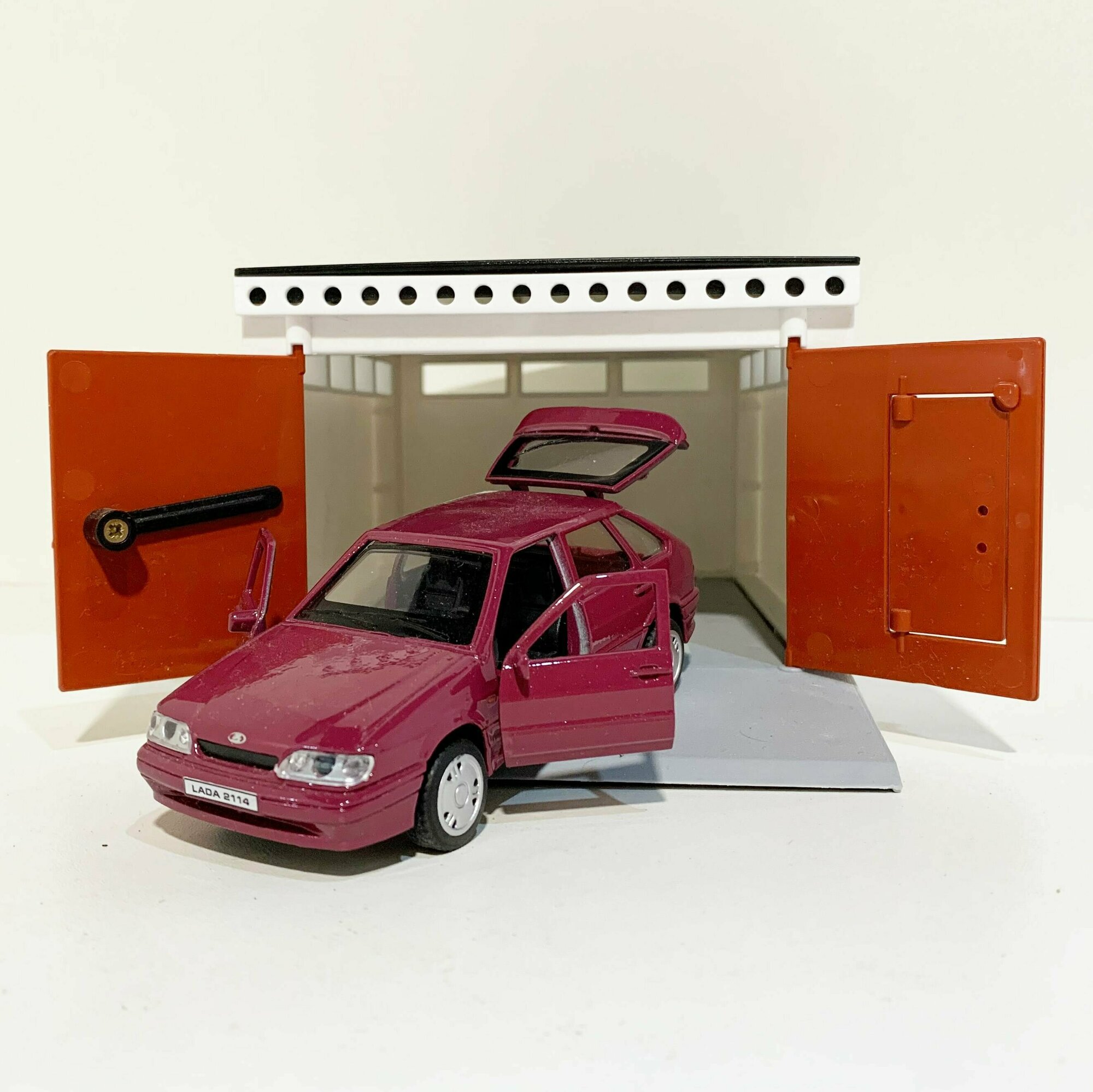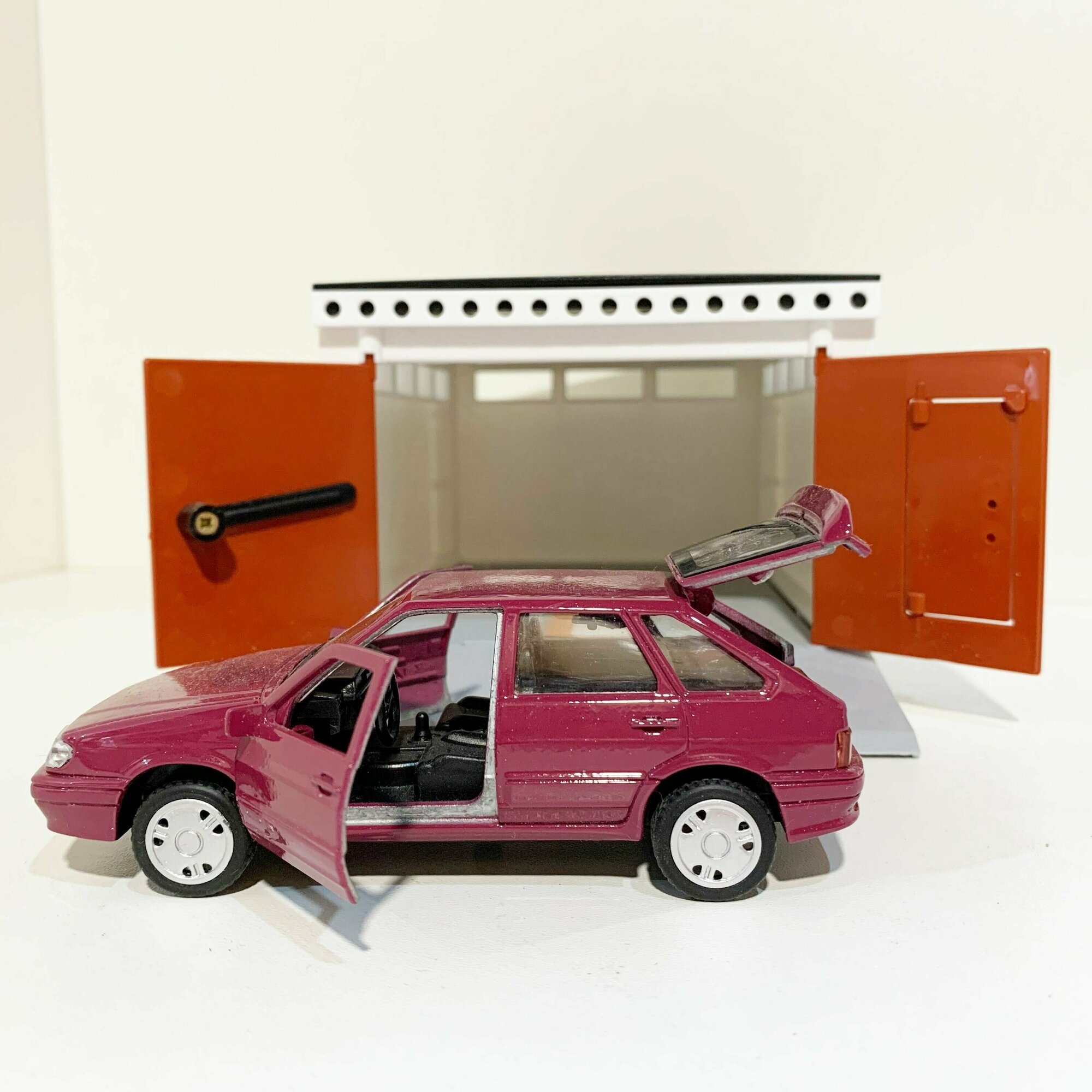 Гараж ретро и металлическая инерционная машинка ВАЗ 2114 (инерция, 12 см, откр. 2-х дверей и багажника) -бордовая информация: