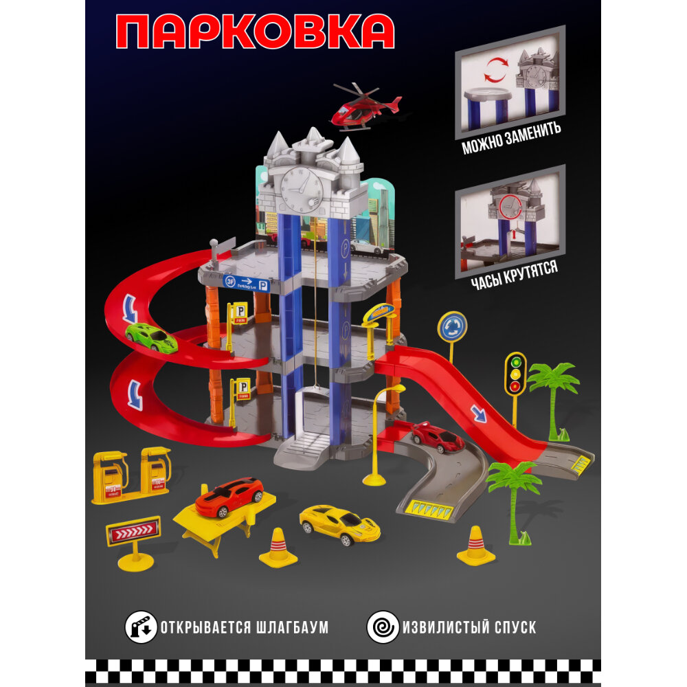 10 цен на Игрушечная многоуровневая парковка гараж 25 х 50 см для машинок, 55 деталей, 2 машины и вертолёт, механический лифт