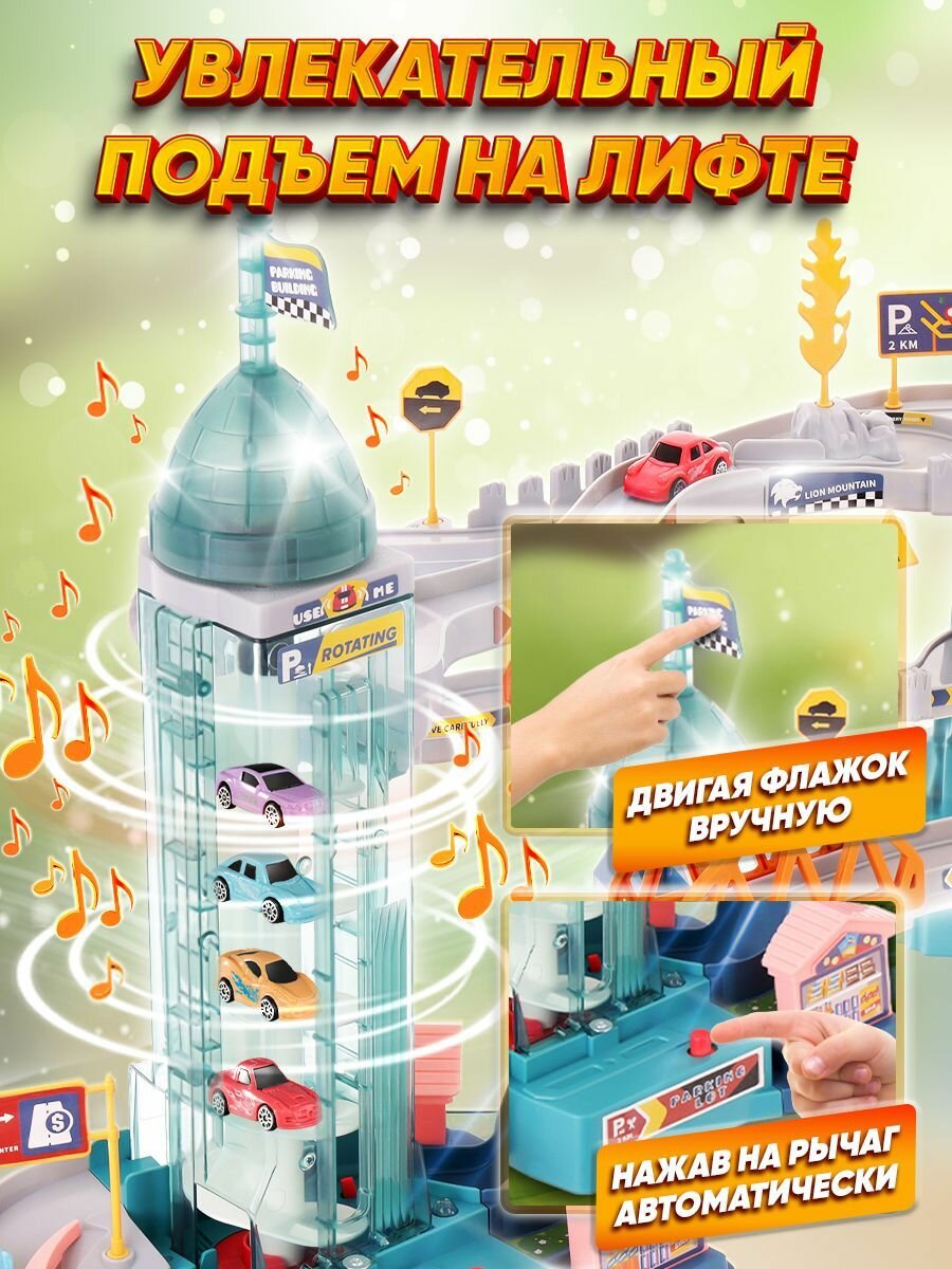 Парковка для машинок с лифтом, музыкой и светом Play Okay "Логово льва", Гараж детский с горкой, Игровой набор, Конструктор паркинг информация: