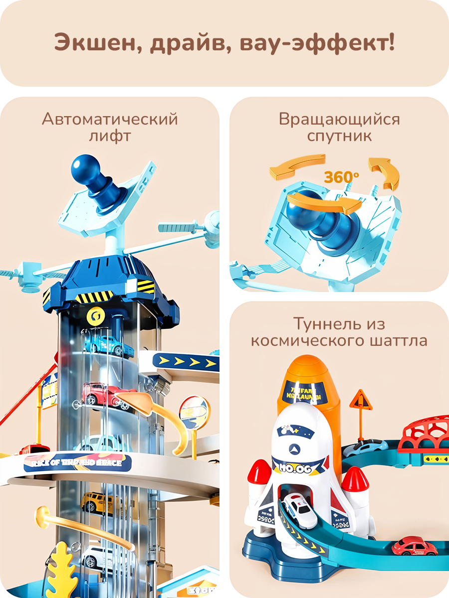 Парковка для машинок с лифтом, музыкой и светом Play Okay "Космический шаттл", Гараж детский с горкой, Игровой набор, Конструктор паркинг информация: