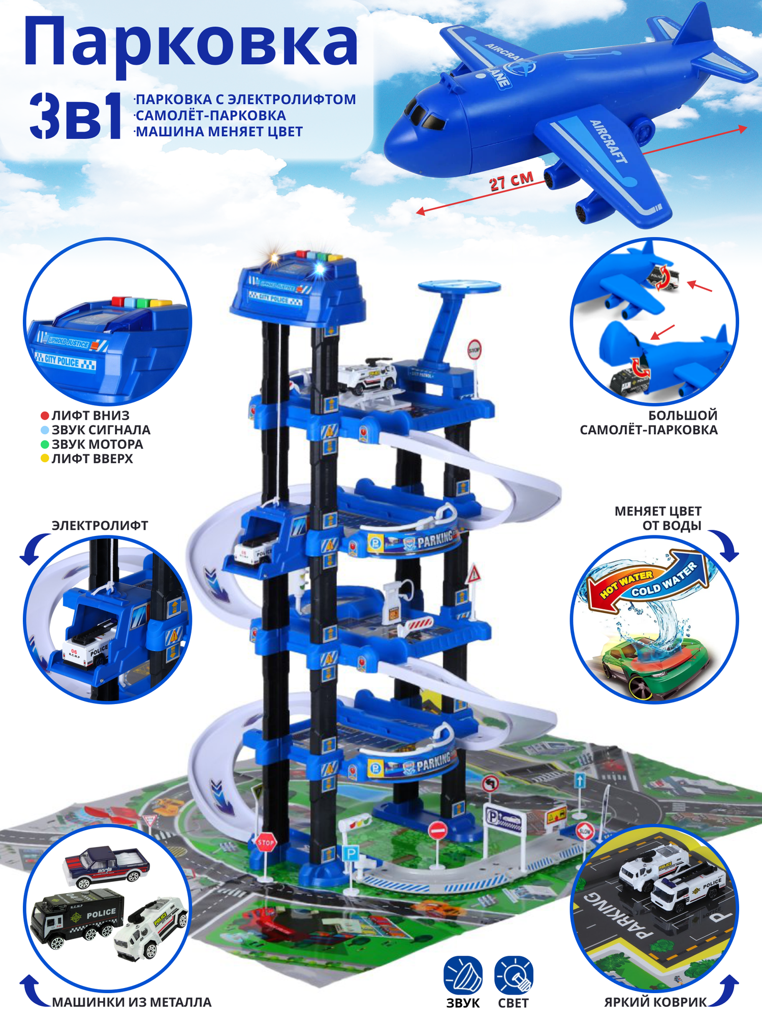 Игровой набор многоуровневая Полицейская парковка гараж с самолетом, 79 деталей, свет, звук, 3 машинки меняющие цвет, лифт от кнопки информация: