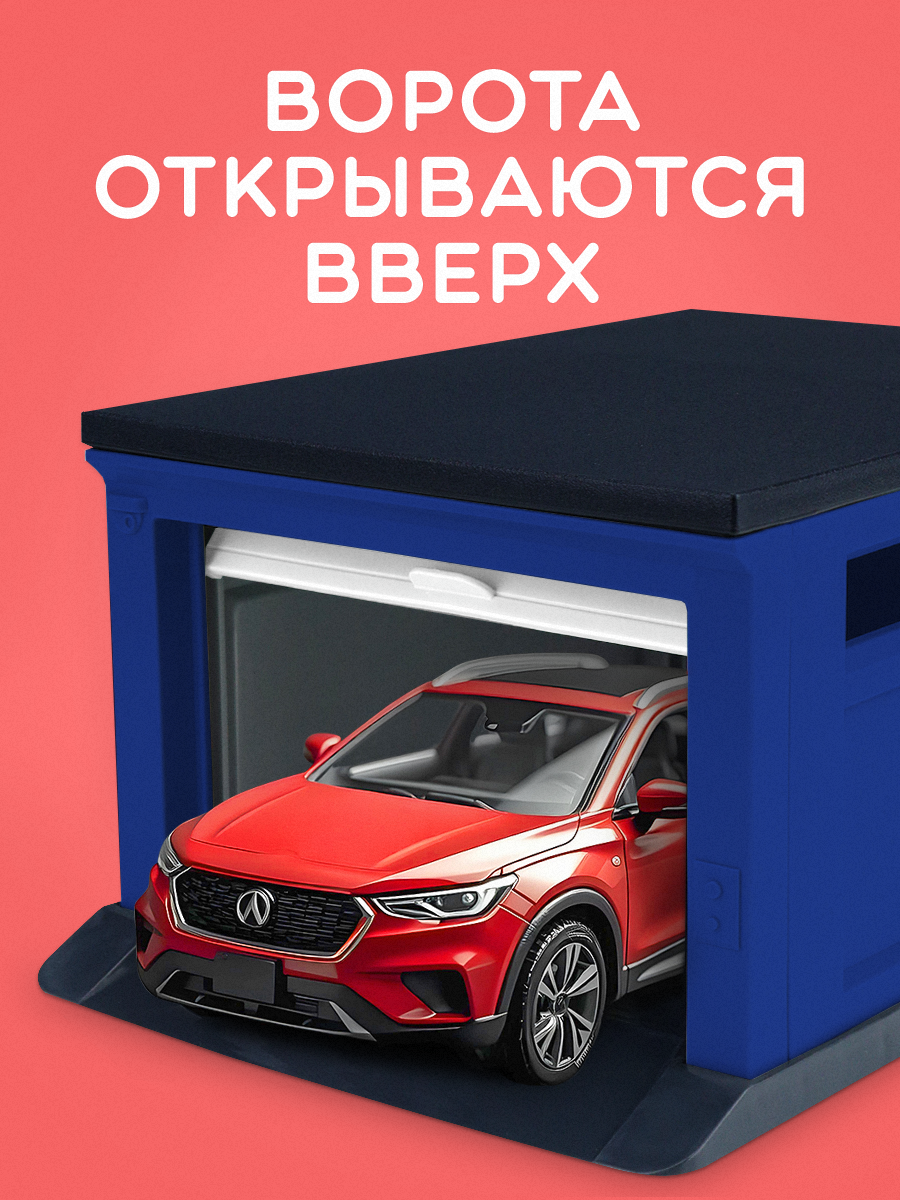 Гараж для игрушечных машинок с воротами (синий, белый, чёрный, серый) 187х136х95 мм. В комплекте - 2 набора информация: