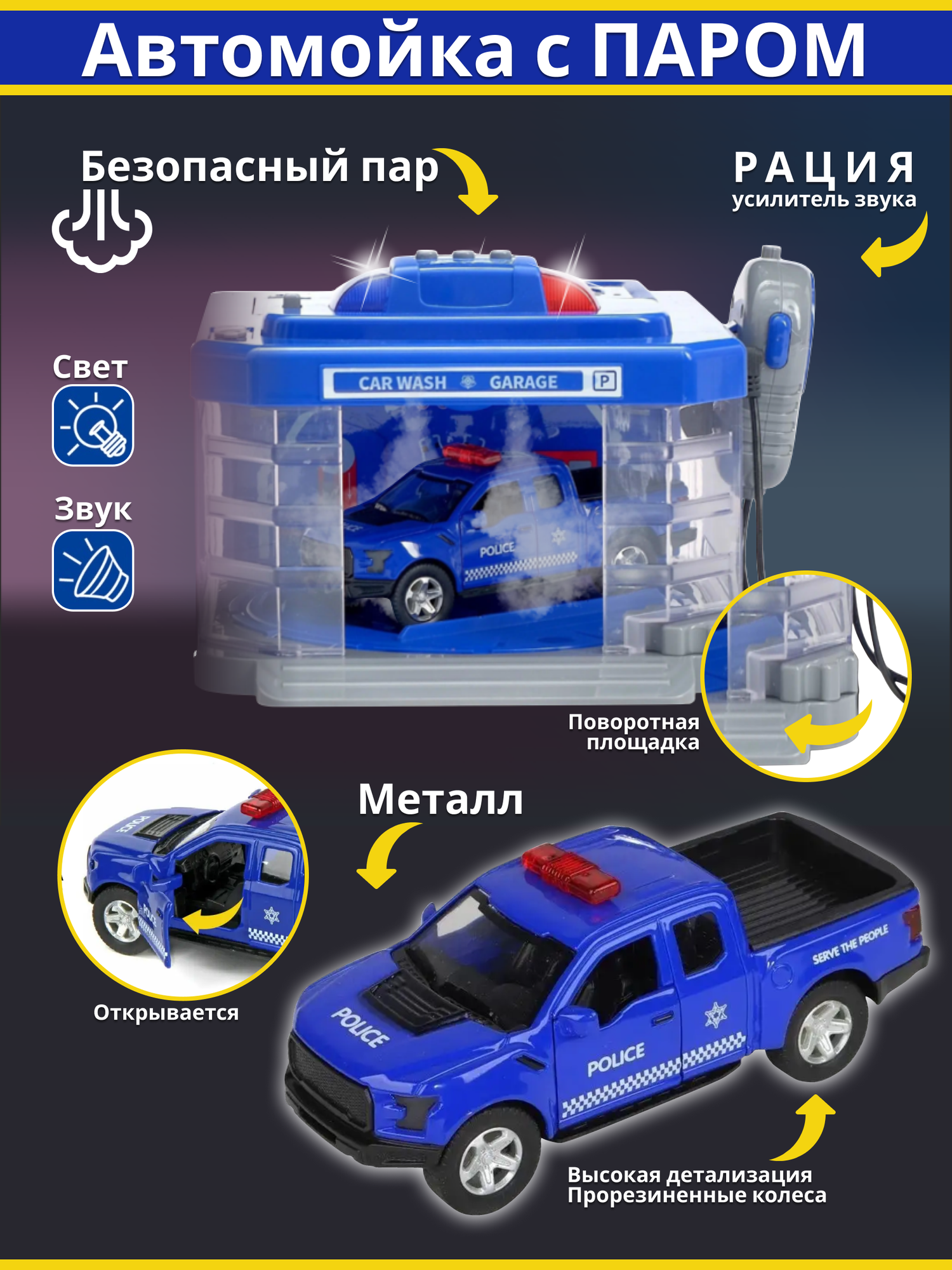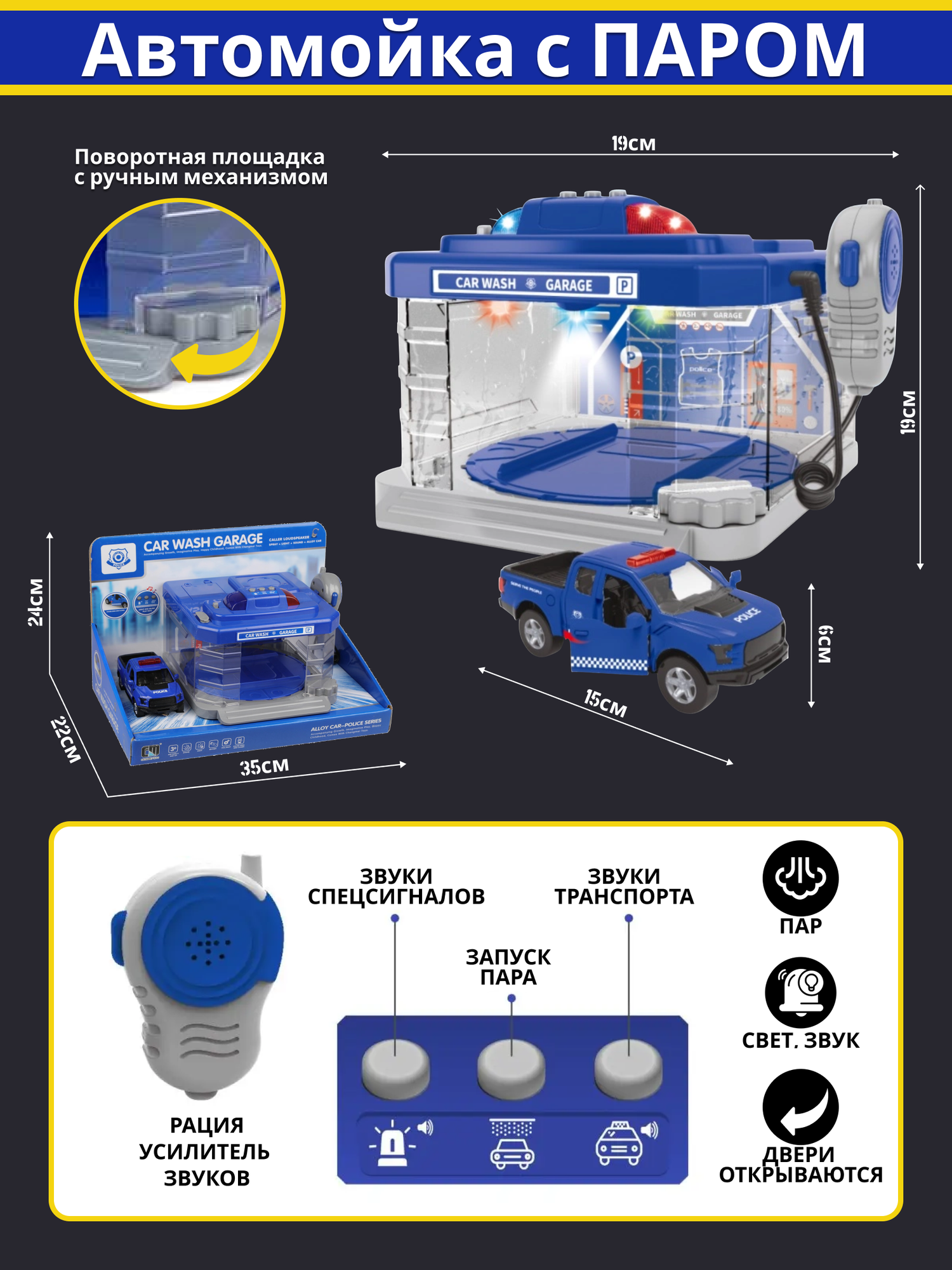 Игрушка автомойка с паром с металлической полицейской машиной для мальчика, световые и звуковые эффекты информация: