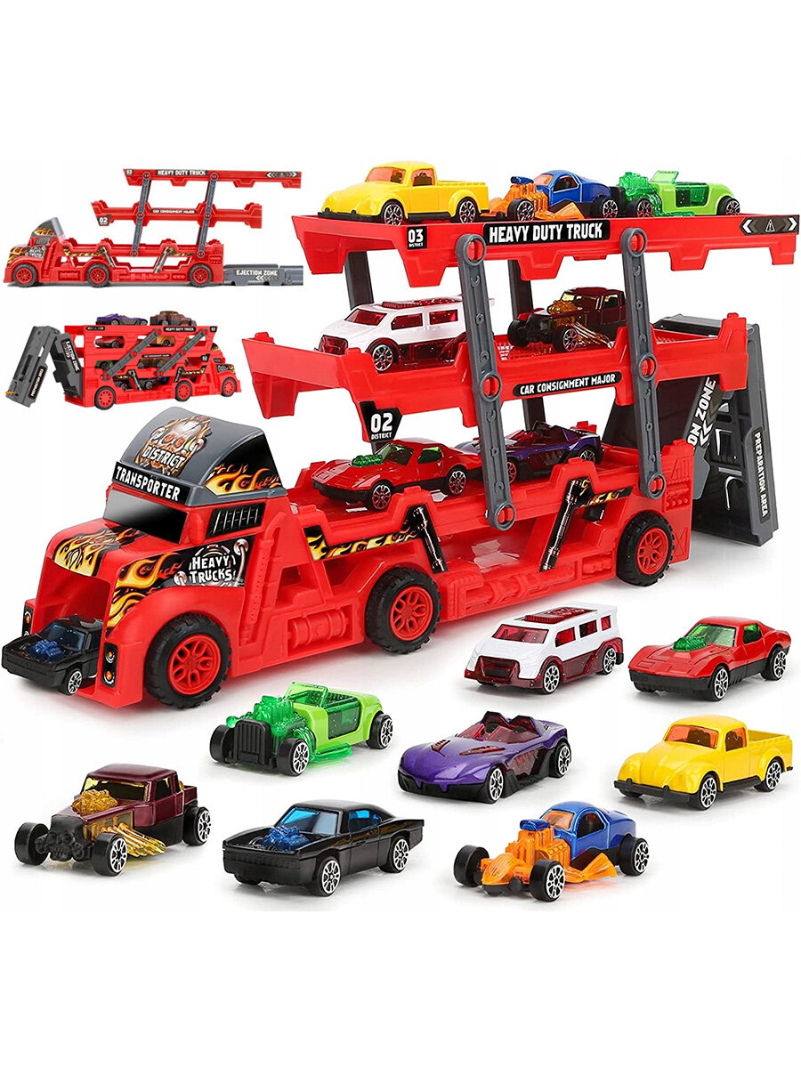 10 цен на Мини автотрек грузовик трейлер с катапультой красный 8 машинок 47х7,2х15,2 см