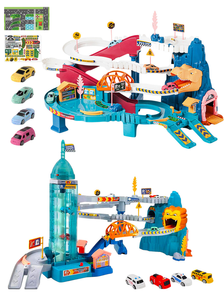 10 цен на Автотрек большой многоуровневый детский Лев и Динозавр Мультитрек сборный свет звук автолифт парковка с машинками