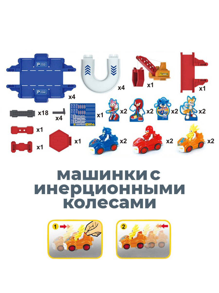 10 цен на Автотрек парковка с машинками Соник Sonic the hedgehog сборный 4 уровня автолифт 6 машинок инерция 75,5x50x50 см