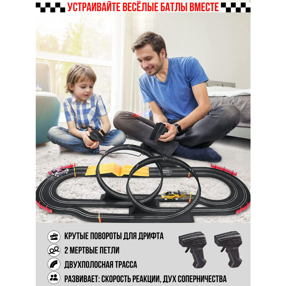Отзывы на Детский гоночный автотрек с 2 машинками на пульте управления, работает от адаптера или батареек, длина трассы 560 см