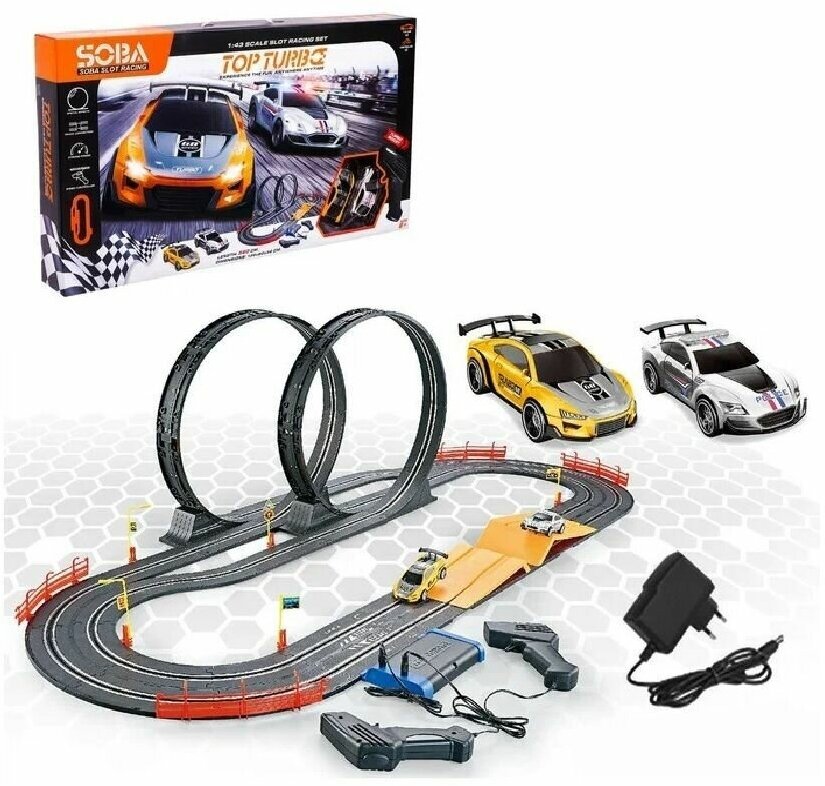 10 цен на Детский гоночный автотрек с 2 машинками на пульте управления, работает от адаптера или батареек, длина трассы 560 см