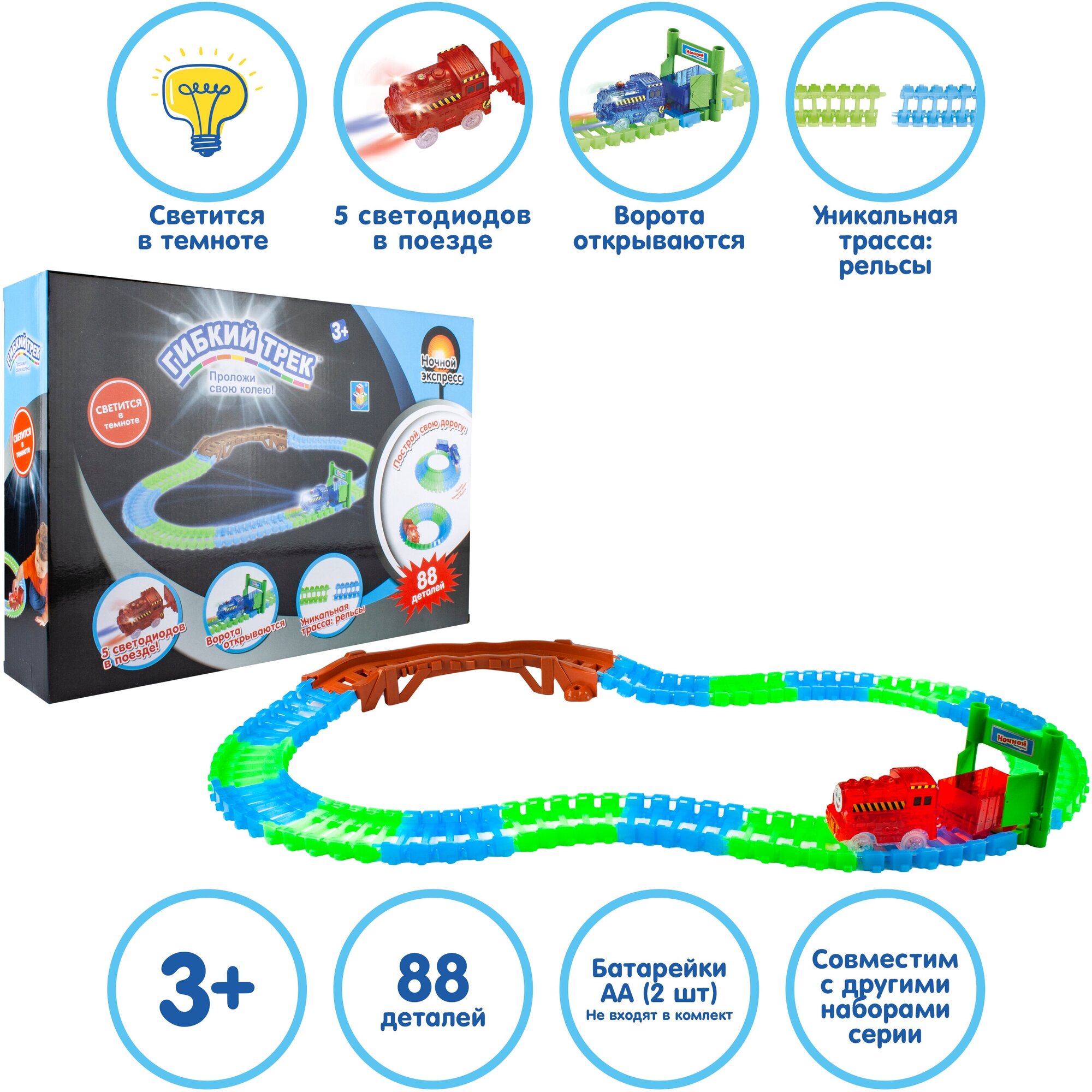 Гибкий трек светящийся с поездом со светом 1TOY Ночной Экспресс, трасса для машинок, дорога, автотрек, 88 деталей информация: