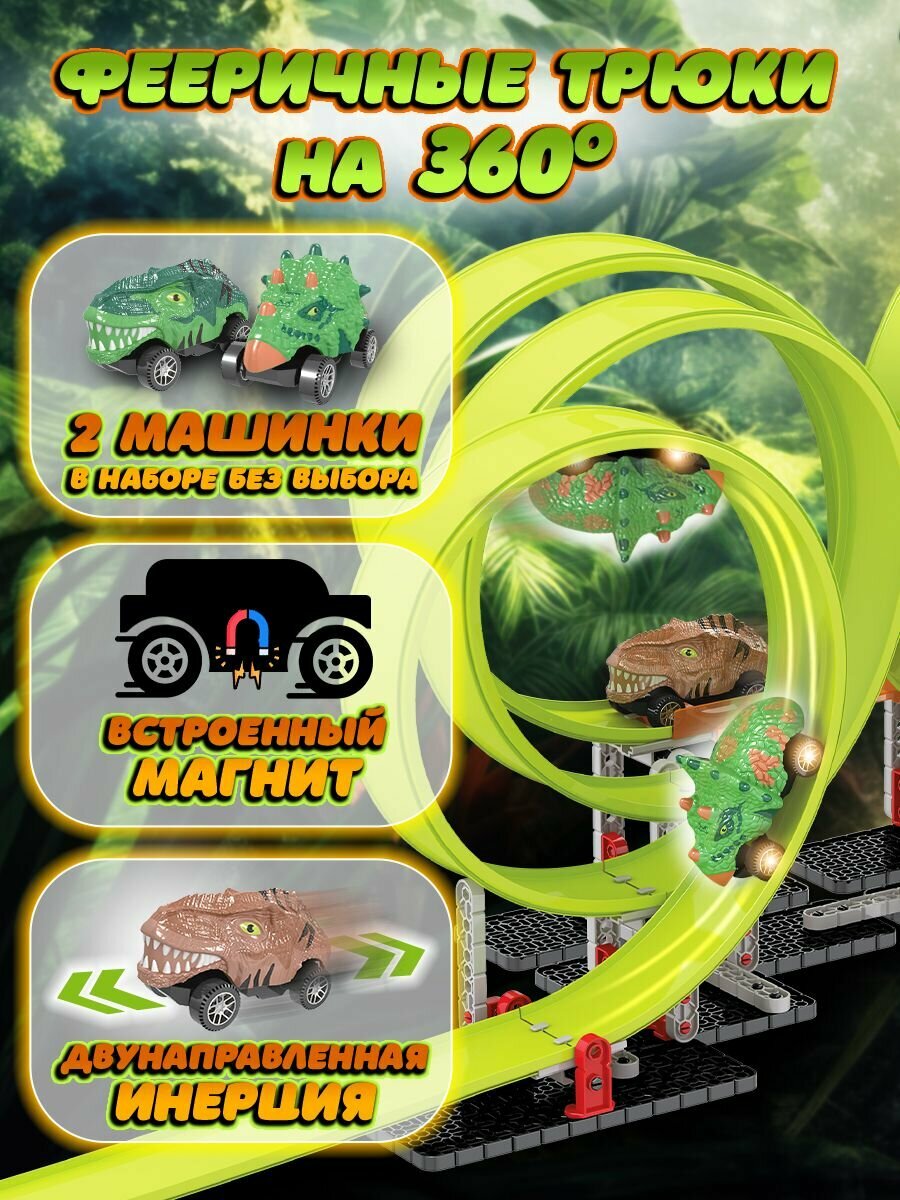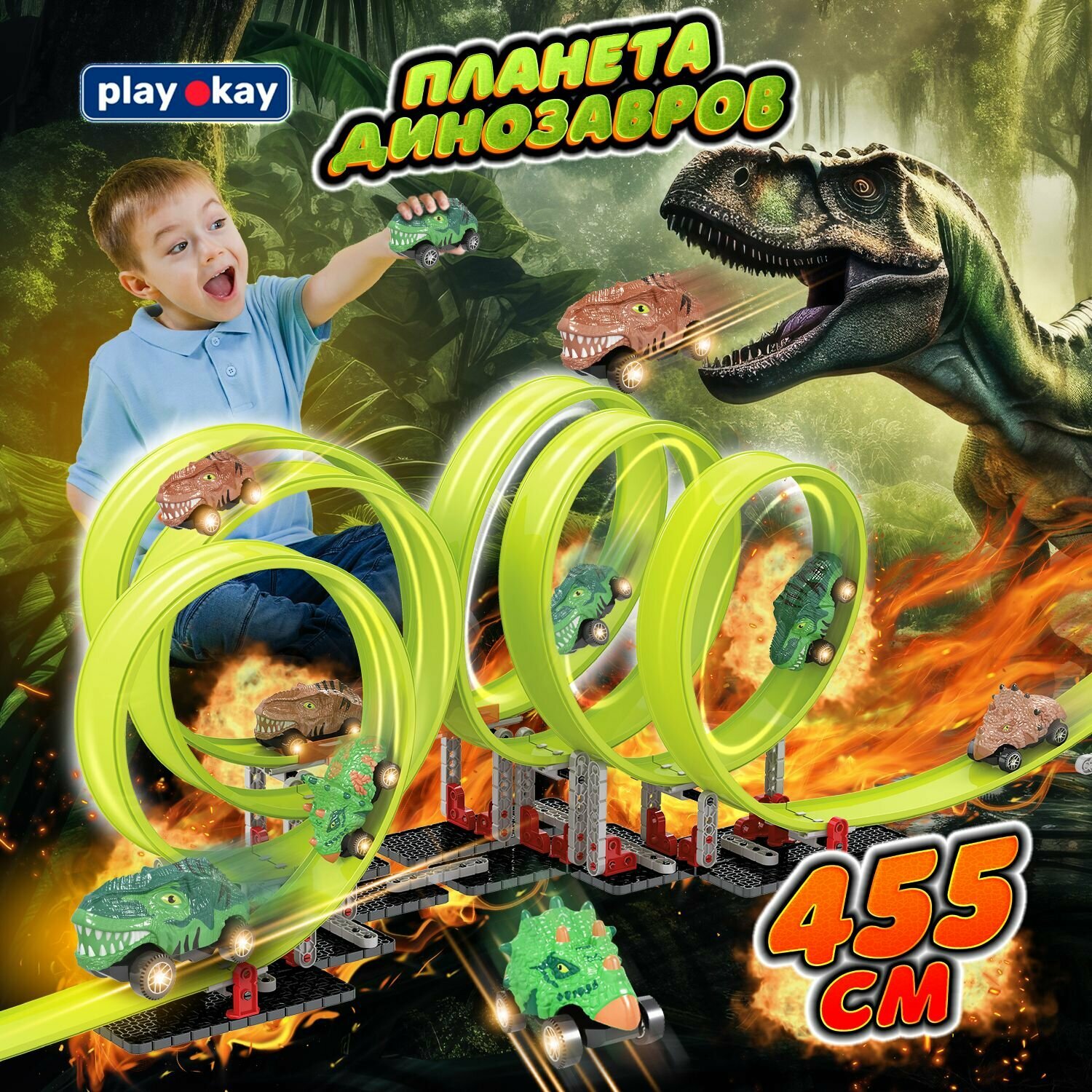 10 цен на Автотрек с машинками динозаврами на магнитах Play Okay, гибкий детский гоночный трек Мертвая петля, 99 деталей