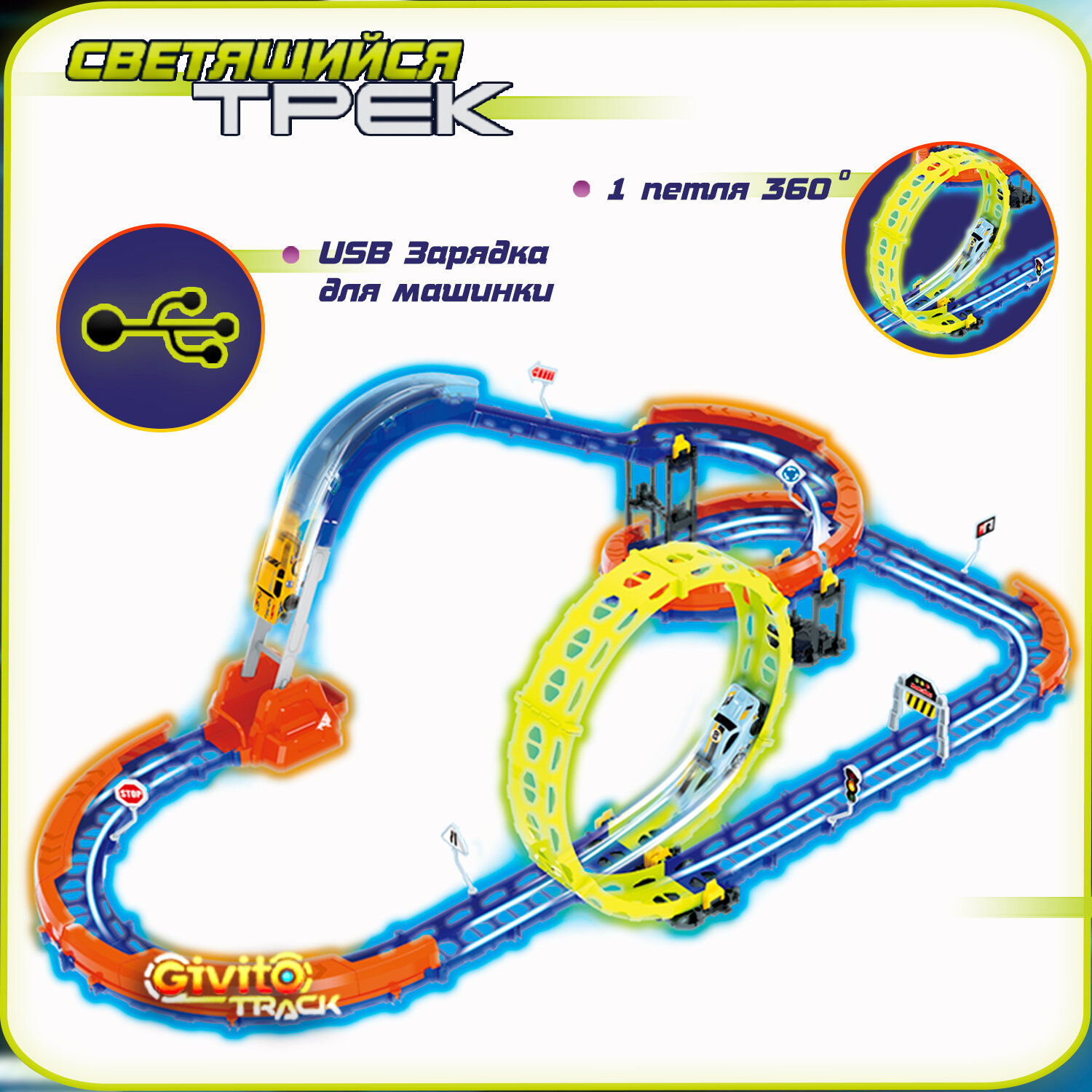 Детский гоночный светящийся гибкий автотрек Givito с машинкой-перевертышем (петля 360°), 53 детали G2412-496 информация: