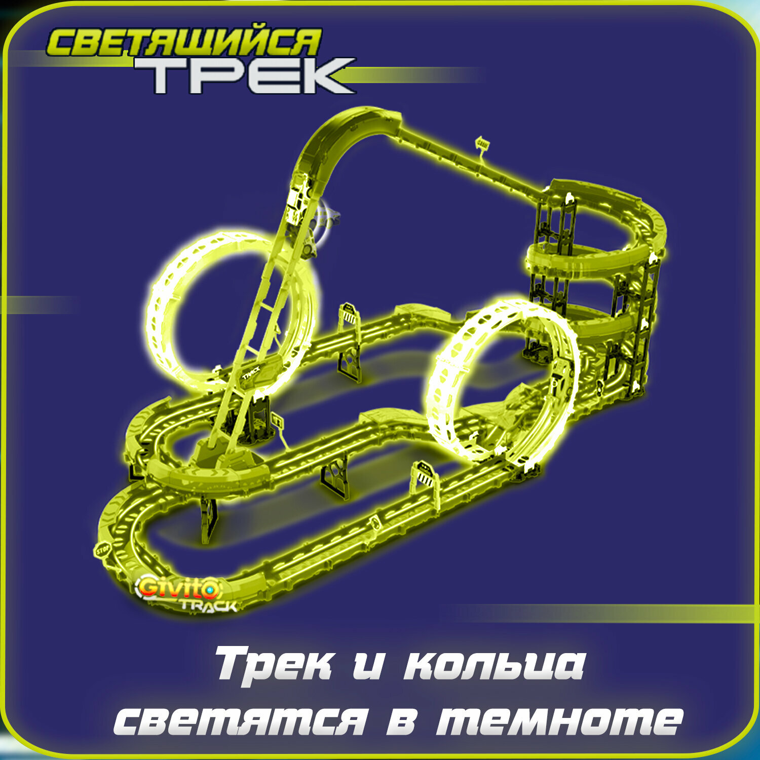 Детский гоночный светящийся гибкий автотрек Givito (2 петли 360°), 2 машинки-перевертыша, 116 деталей G2412-498 информация: