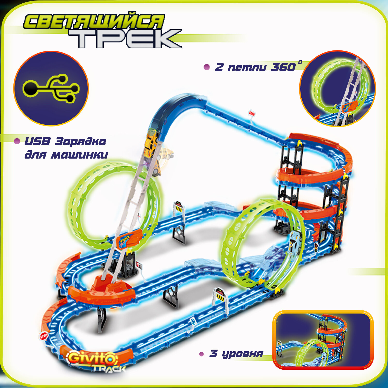 10 цен на Детский гоночный светящийся гибкий автотрек Givito (2 петли 360°), 2 машинки-перевертыша, 116 деталей G2412-498