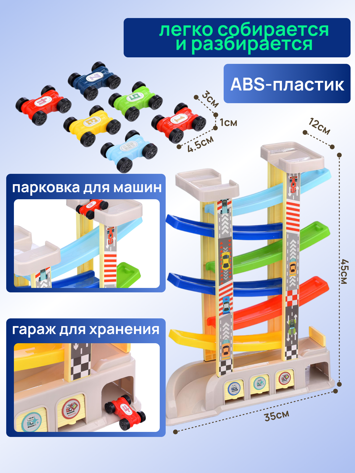 Автотрек с гаражом и с машинками, горка с машинками, автотрек 6 уровней информация: